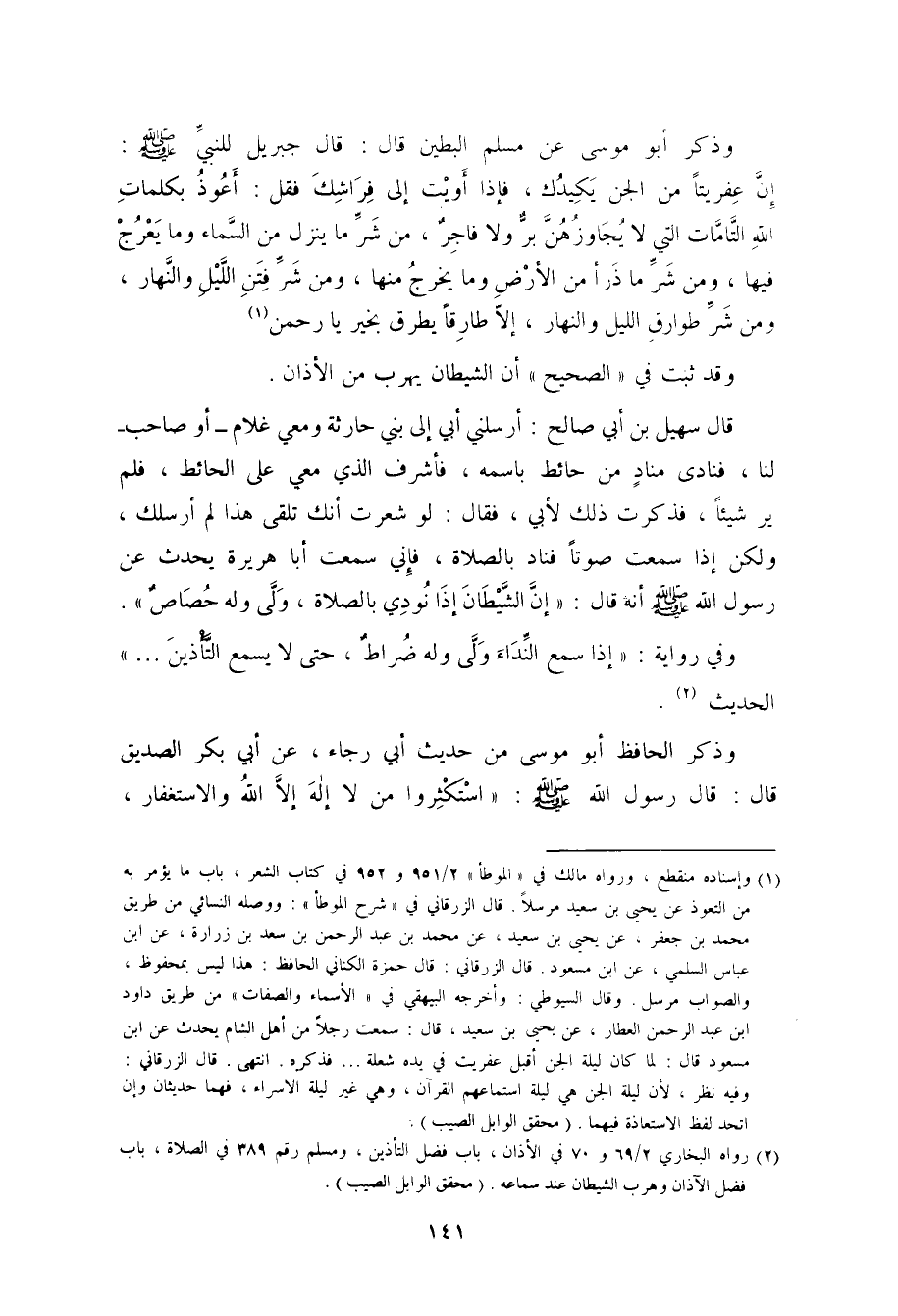 قال سهيل بن أبي صالح: " أرسلني أبي إلى بني حارثة ومعي غلام - أو صاحب لنا - فناداه منادٍ من حائط باسمه قال: وأشرف الذي معي على الحائط، فلم ير شيئاً، فذكرت ذلك لأبي، فقال: لو شعرت أنك تلقى هذا لم أرسلك، ولكن إذا سمعت صوتاً فناد بالصلاة، فإني سمعت أبا هريرة يحدث عن رسول الله صلى الله عليه وسلم أنه قال: (إنّ الشيطان إذا نودي بالصلاة، ولى وله حصاص) (¬1) .