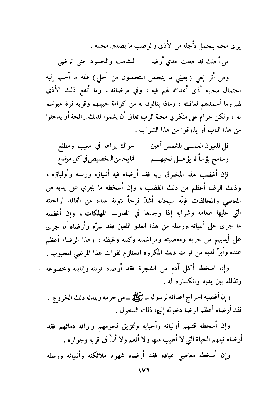 ومن أثر إلهي: (بغيتي ما يتحمل المتحملون من أجلي) ، فالله ما أحب إليه احتمال محبيه أذى أعدائه لهم فيه، وفي مرضاته، وما أنفع ذلك الأذى لهم، وما أحمدهم لعاقبته، وماذا ينالون به من كرامة حبيبهم وقربه قرة عيونهم به، ولكن حرام على منكري محبة الرب تعالى أن يشموا لذلك رائحة، أو يدخلوا من هذا الباب، أو يذوقوا من هذا الشراب.