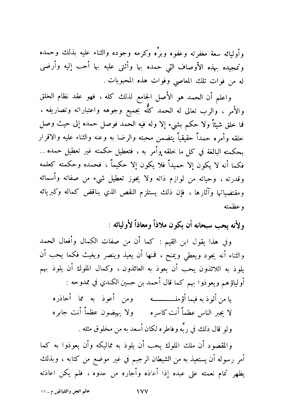 والمقصود أن ملك الملوك يحب أن يلوذ به مماليكه، وأن يعوذوا به، كما أمر رسوله أن يستعيذ به من الشيطان الرجيم في غير موضع من كتابه، وبذلك يظهر تمام نعمته على عبده إذا أعاذه وأجاره من عدوه، فلم يكن إعاذته