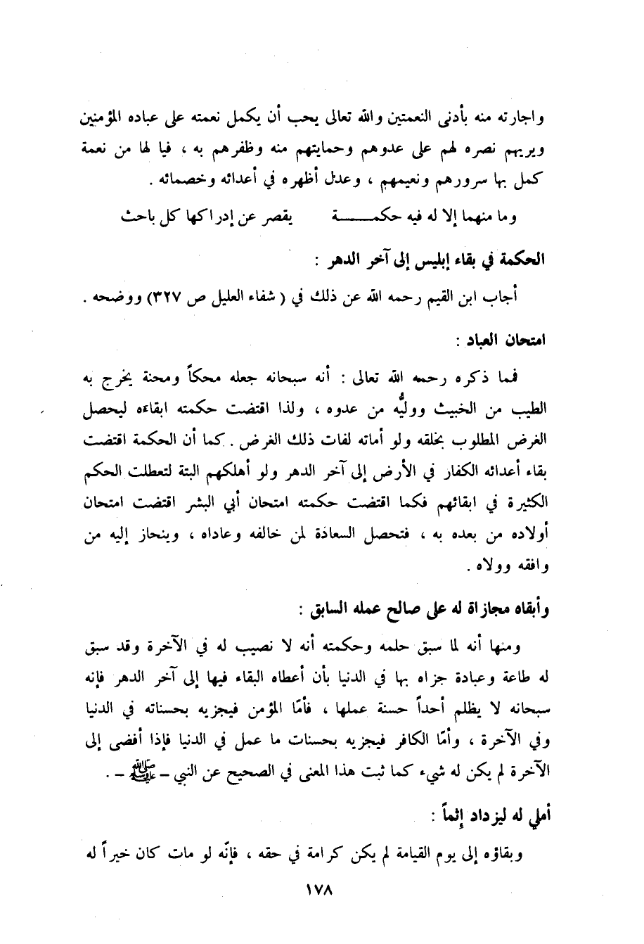 ومنها أنه لما سبق حكمه وحكمته أنه لا نصيب له في الآخرة، وقد سبق له طاعة وعبادة، جزاه بها في الدنيا بأن أعطاه البقاء فيها إلى آخر الدهر، فإنه سبحانه لا يظلم أحداً حسنة عملها، فأمّا المؤمن، فيجزيه بحسناته في الدنيا والآخرة، وأمّا الكافر، فيجزيه بحسناته ما عمل في الدنيا، فإذا أفضى إلى الآخرة، لم يكن له شيء، كما ثبت هذا المعنى في الصحيح عن النبي صلى الله عليه وسلم.
