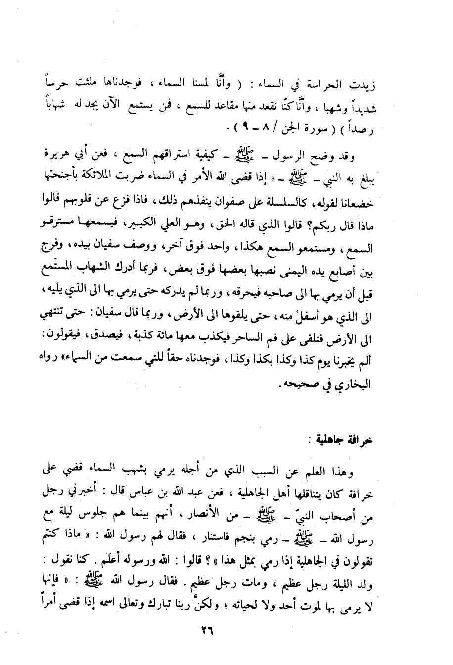 ومعرفة السبب الذي من أجله يرمي بشهب السماء قضى على خرافة كان يتناقلها أهل الجاهلية، فعن عبد الله بن عباس قال: أخبرني رجل من أصحاب النبي صلى الله عليه وسلم من الأنصار: أنهم بينما هم جلوس ليلة مع رسول الله صلى الله عليه وسلم رمي بنجم فاستنار، فقال لهم رسول الله صلى الله عليه وسلم: (ماذا كنتم تقولون في الجاهلية إذا رمي بمثل هذا) ؟