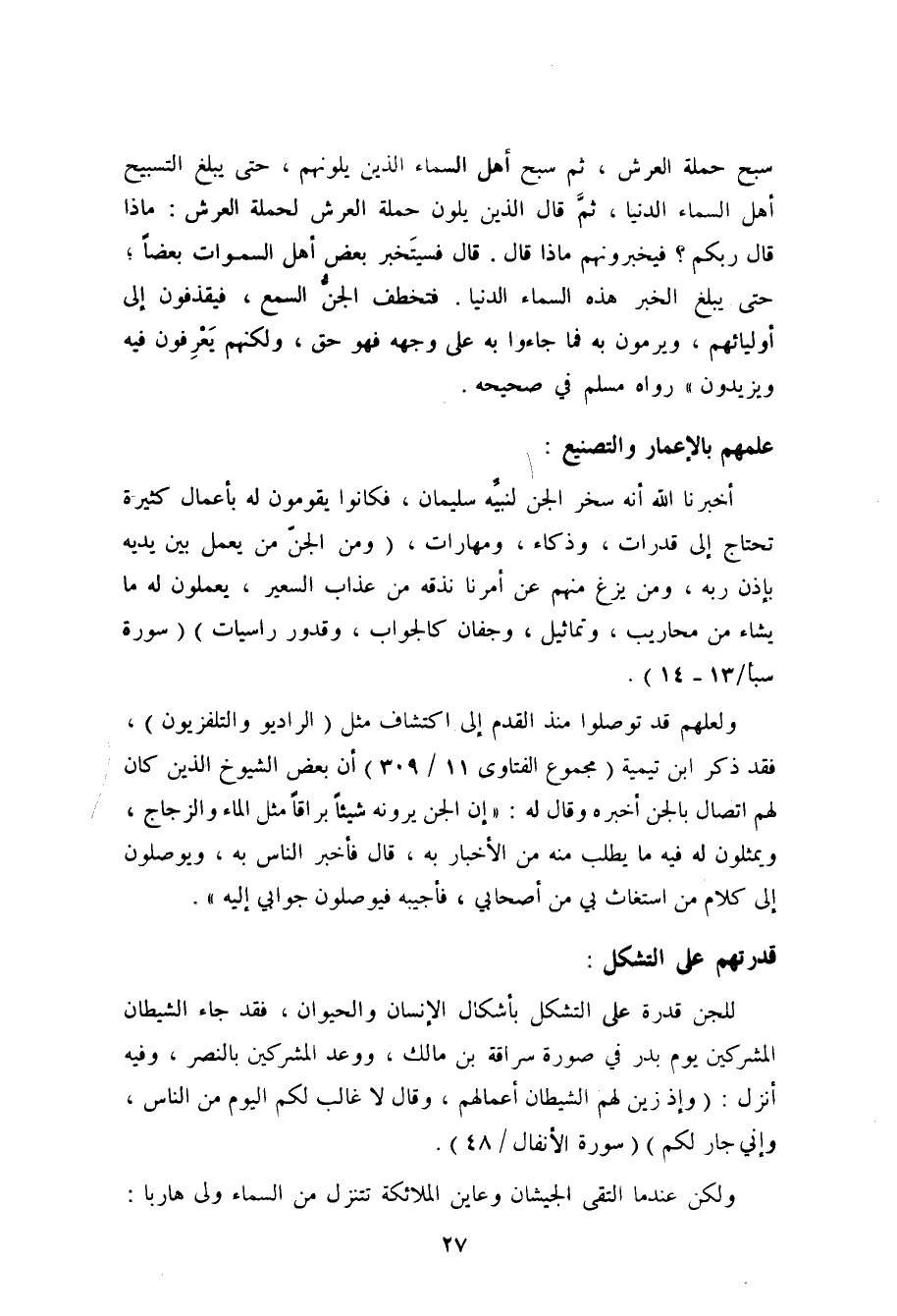 سبّح حملة العرش، ثم سبح أهل السماء الذين يلونهم، حتى يبلغ التسبيح أهل هذه السماء الدنيا، ثمّ قال الذين يلون حملة العرش لحملة العرش: ماذا قال ربكم؟ فيخبرونهم ماذا قال، قال فيستخبر بعض أهل السماوات بعضاً؛ حتى يبلغ الخبر هذه السماء الدنيا، فتخطف الجنّ السمع، فيقذفون إلى أوليائهم، ويرمون به، فما جاؤوا به على وجهه فهو حق، ولكنهم يَقْرِفون فيه ويزيدون) (¬1) .