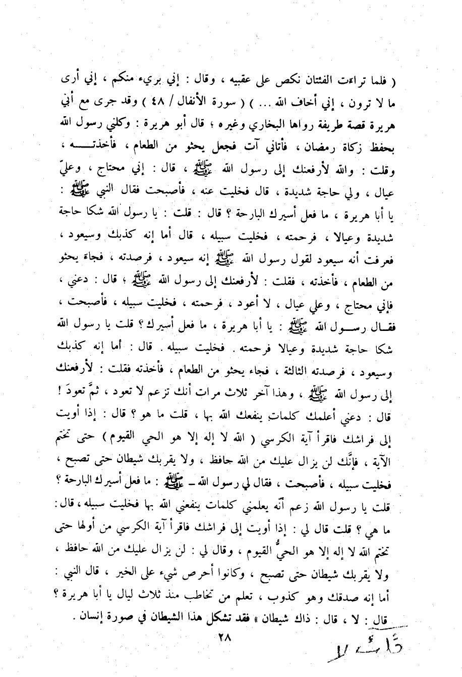 قال: قلت: يا رسول الله شكا حاجة شديدة وعيالاً، فرحمته، فخليت سبيله، قال: (أما إنه كذبك وسيعود) ، فعرفت أنه سيعود لقول رسول الله صلى الله عليه وسلم: إنه سيعود، فرصدته، فجاءَ يحثو من الطعام، فأخذته، فقلت: لأرفعنك إلى رسول الله صلى الله عليه وسلم؛ قال: دعني فإني محتاج، وعليّ عيال، لا أعود، فرحمته، فخليت سبيله، فأصبحت، فقال لي رسول الله صلى الله عليه وسلم: (يا أبا هريرة، ما فعل أسيرك؟) قلت: يا رسول الله شكا حاجة شديدة وعيالاً، فرحمته، فخليت سبيله.