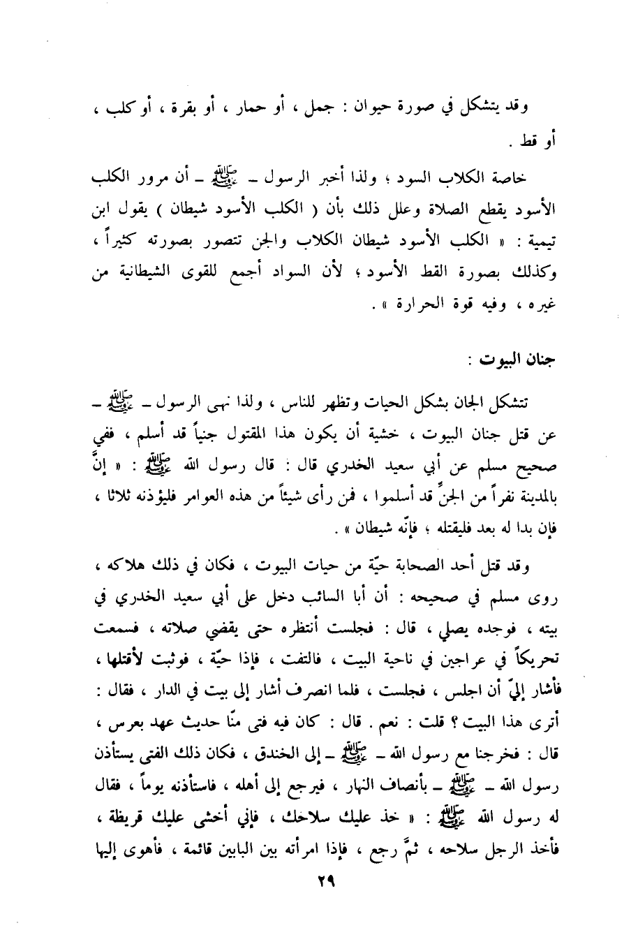تتشكل الجان بشكل الحيات وتظهر للناس، ولذا نهى الرسول صلى الله عليه وسلم عن قتل الحيات البيوت، خشية أن يكون هذا المقتول جنياً قد أسلم، ففي صحيح مسلم عن أبي سعيد الخدري قال: قال رسول الله صلى الله عليه وسلم: (إنّ بالمدينة جنّاً قد أسلموا، فإذا رأيتم منهم شيئاً فآذنوه ثلاثة أيام، فإن بدا لكم بعد ذلك فاقتلوه، فإنما هو شيطان) (¬2) .
