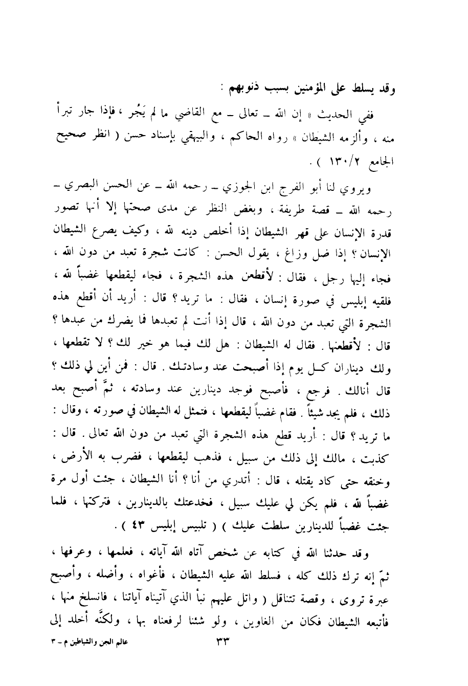 فذهب ليقطعها، فضرب به الأرض، وخنقه حتى كاد يقتله، قال: أتدري من أنا؟ أنا الشيطان، جئت أول مرة غضباً لله، فلم يكن لي عليك سبيل، فخدعتك بالدينارين، فتركتها، فلما جئت غضباً للدينارين سلطت عليك (¬2) .