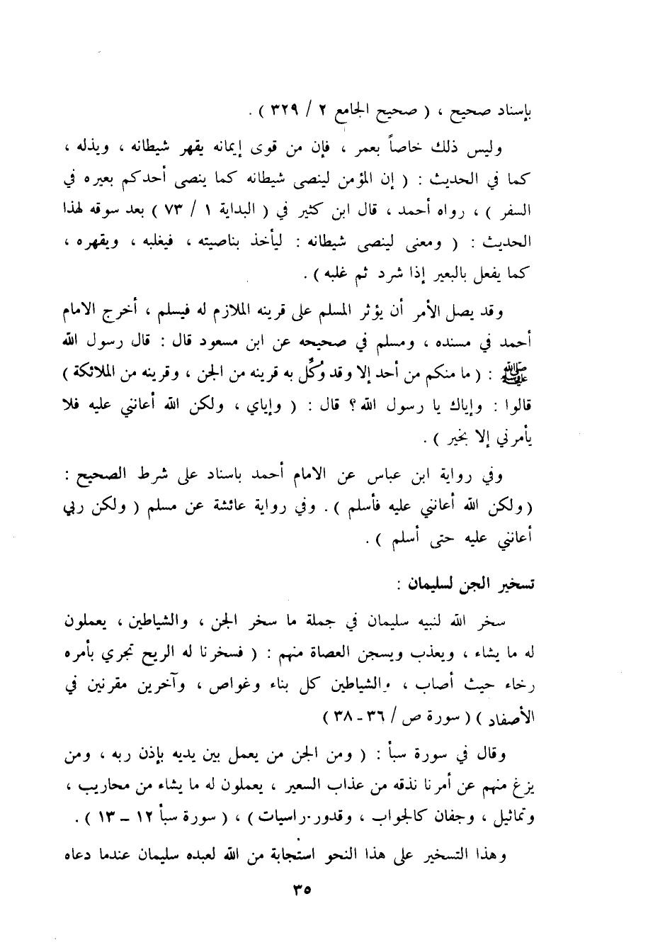وليس ذلك خاصاً بعمر، فإن مَن قوي إيمانه يقهر شيطانه، ويذله، كما في الحديث: (إن المؤمن لينصي شيطانه كما ينصي أحدكم بعيره في السفر) . رواه أحمد. قال ابن كثير (¬1) : بعد أن ساق هذا الحديث: " ومعنى لينصي شيطانه: ليأخذ بناصيته، فيغلبه، ويقهره، كما يفعل بالعبير إذا شرد ثم غلبه ".