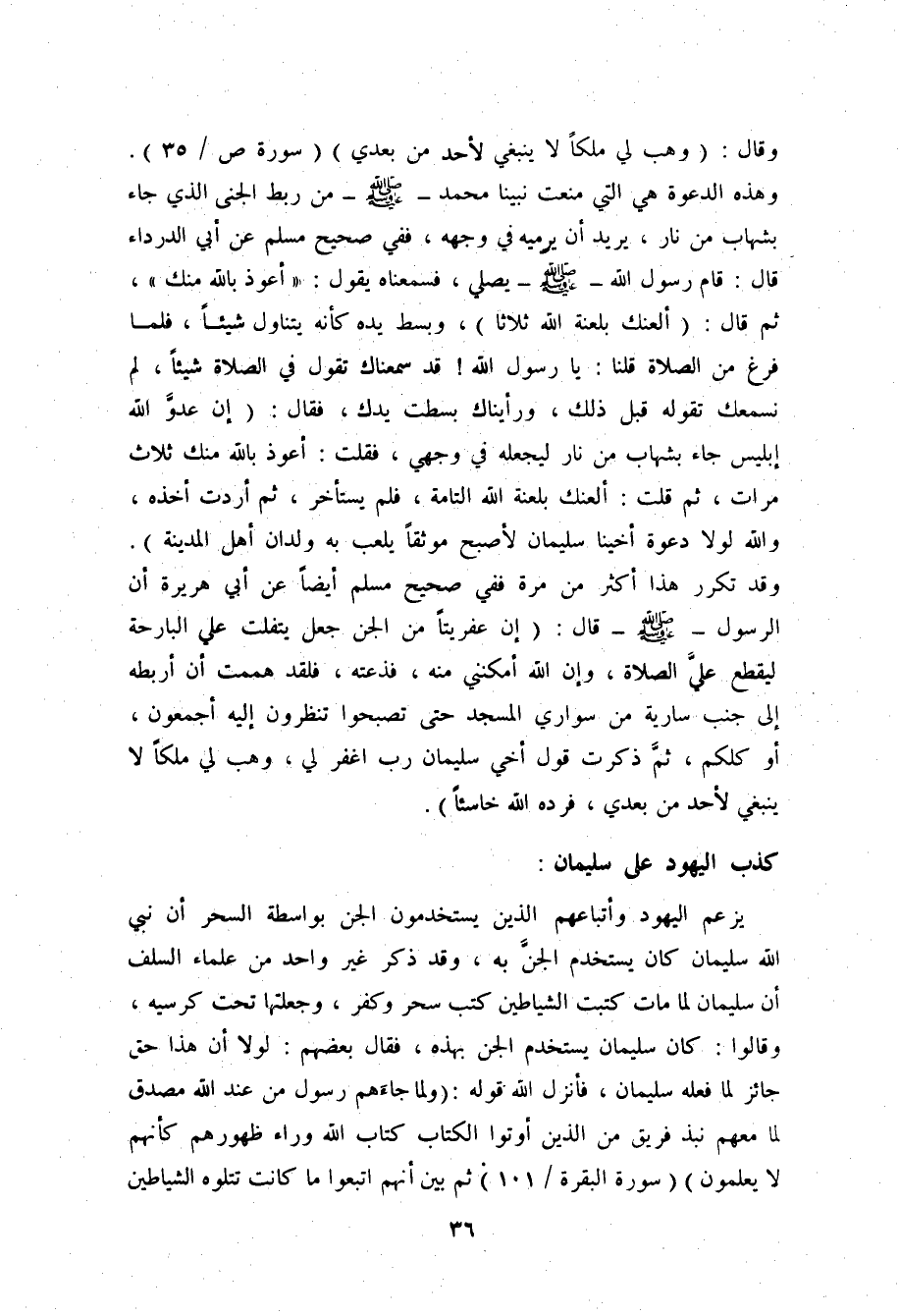 وقال: (وهب لي مُلكاً لاَّ ينبغي لأحدٍ من بعدي) [ص: 35] . وهذه الدعوة هي التي منعت نبينا محمداً صلى الله عليه وسلم من ربط الجني الذي جاء بشهاب من نار، يريد أن يرميه في وجهه، ففي صحيح مسلم عن أبي الدرداء قال: قام رسول الله صلى الله عليه وسلم، فسمعناه يقول: (أعوذ بالله منك) ثم قال: (ألعنك بلعنة الله ثلاثاً) ، وبسط يده كأنه يتناول شيئاً.