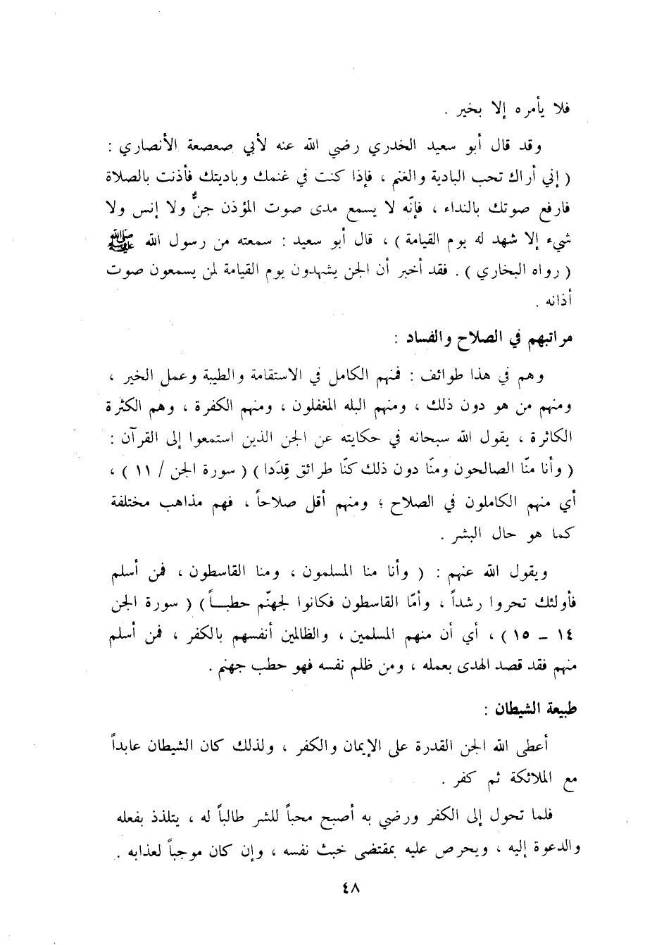 يقول الله سبحانه في حكايته عن الجن الذين استمعوا إلى القرآن: (وأنَّا منَّا الصَّالحون ومنَّا دون ذلك كنَّا طرائِق قدداً) [الجن: 11] ؛ أي منهم الكاملون في الصلاح، ومنهم أقل صلاحاً، فهم مذاهب مختلفة، كما هو حال البشر.