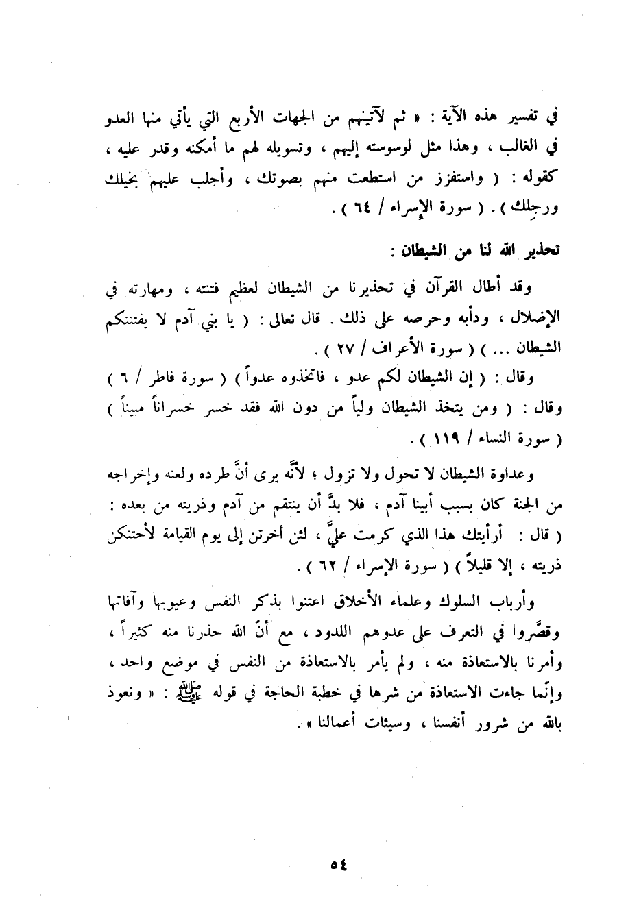 وقد أطال القرآن في تحذيرنا من الشيطان لعظم فتنته، ومهارته في الإضلال، ودأبه وحرصه على ذلك: (يا بني آدم لا يفتننَّكم الشَّيطان) [الأعراف: 27] .
