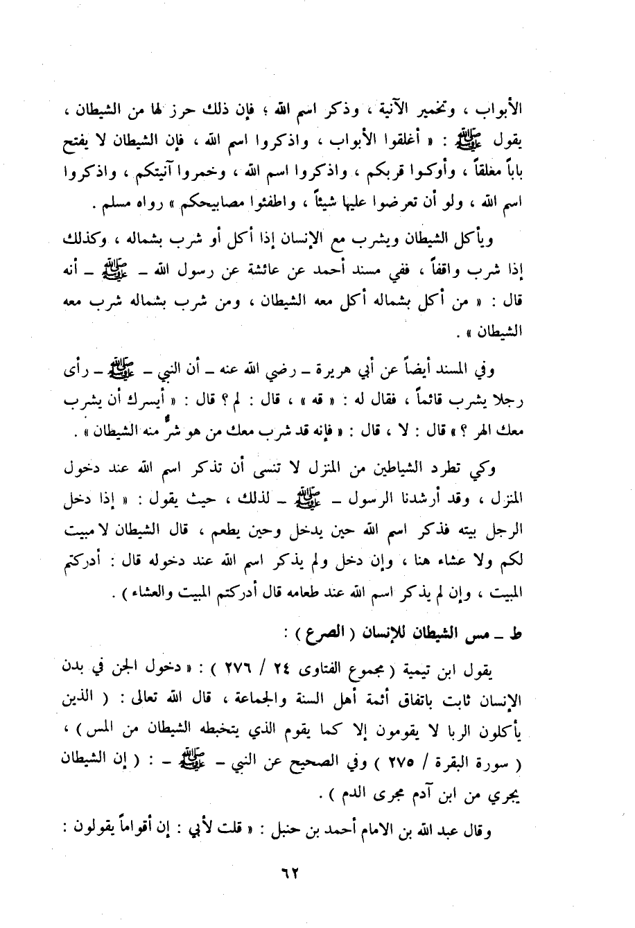 يقول ابن تيمية (¬4) : " دخول الجن في بدن الإنسان ثابت باتفاق أئمة أهل السنة والجماعة، قال الله تعالى: (الَّذين يأكلون الرِّبَا لا يقومون إلاَّ كما يقوم الَّذي يتخبَّطه الشَّيطان من الْمَسِّ) [البقرة: 275] ، وفي الصحيح عن النبي صلى الله عليه وسلم: (إن الشيطان يجري من الإنسان مجرى الدم) (¬5) .