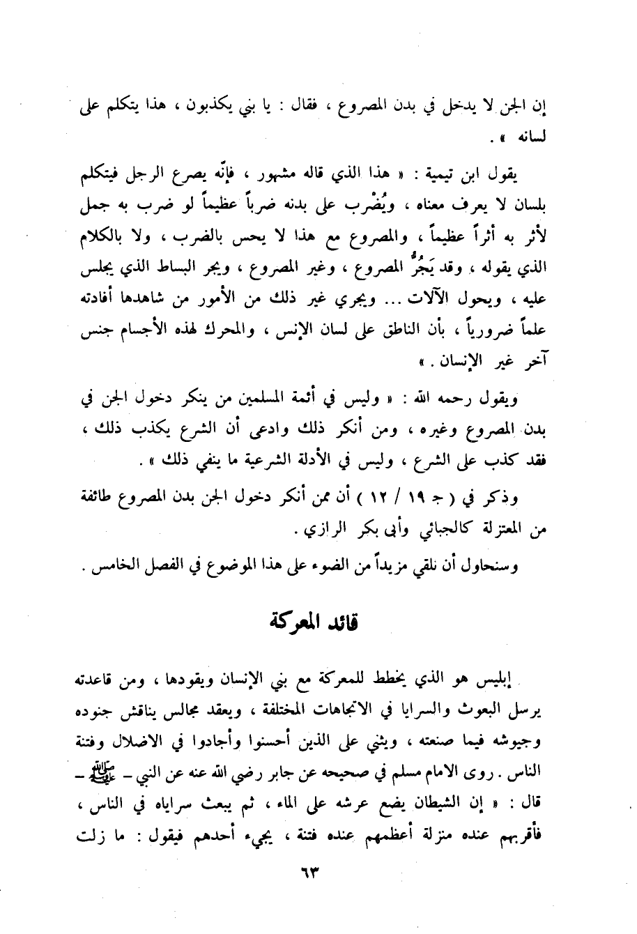 ويقول رحمه الله " وليس في أئمة المسلمين من ينكر دخول الجن في بدن المصروع وغيره، ومن أنكر ذلك، وادعى أن الشرع يكذب ذلك، فقد كذب على الشرع، وليس في الأدلة الشرعية ما ينفي ذلك ".