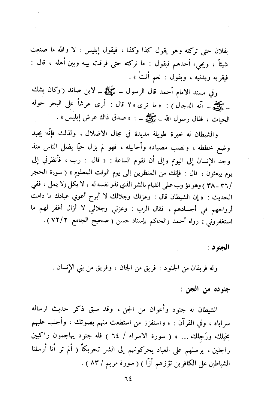 وهو دؤوب على القيام بالشر الذي نذر نفسه له، لا يكل ولا يمل، ففي الحديث: (إن الشيطان قال: وعزتك وجلالك لا أبرح أغوي عبادك ما دامت أرواحهم في أجسادهم، فقال الرب: وعزتي وجلالي لا أزال أغفر لهم ما استغفروني) . رواه أحمد والحاكم بإسناد حسن (¬3) .