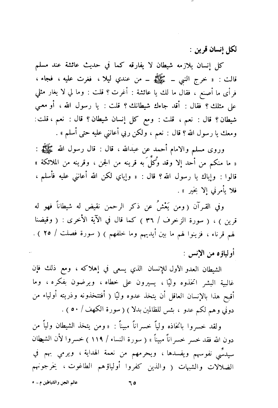 وكل إنسان له شيطان يلازمه لا يفارقه، كما في حديث عائشة عند مسلم: أن رسول الله صلى الله عليه وسلم خرج من عندها ليلاً، قالت: فغرت عليه، فجاء، فرأى ما أصنع، فقال: (ما لك يا عائشة؟ أغرت؟) فقلت: وما لي لا يغار مثلي على مثلك؟ فقال صلى الله عليه وسلم: (أقد جاءك شيطانك) . قالت: يا رسول الله، أو معي شيطان؟ قال: (نعم) ، قلت: ومع كل إنسان؟ قال: (نعم) ، قلت: ومعك يا رسول الله؟ قال: (نعم، ولكن ربي أعانني عليه حتى أسلم) (¬1) .