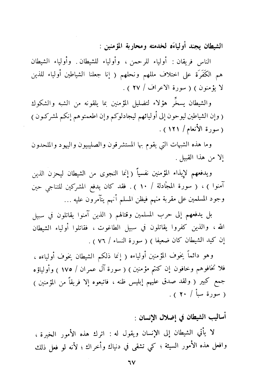 والشيطان يسخّر هؤلاء لتضليل المؤمنين بما يلقونه من الشبه: (وإنَّ الشَّياطين ليوحون إلى أوليائهم ليجادلوكم وإن أطعتموهم إنَّكم لمشركون) [الأنعام: 121] .