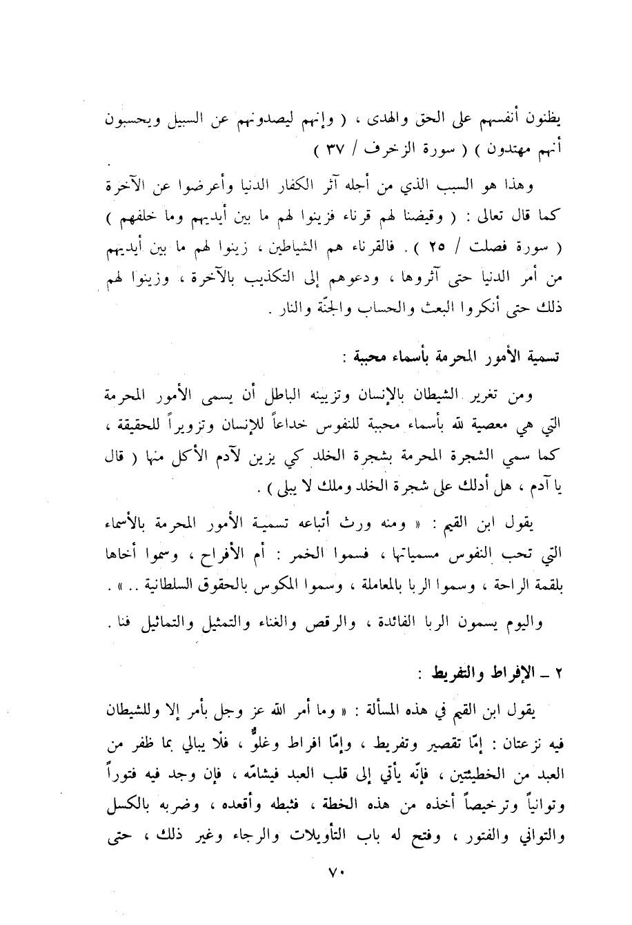 يقول ابن القيم في هذه المسألة: " وما أمر الله - عزّ وجلّ - بأمر إلا وللشيطان فيه نزعتان: إما تقصير وتفريط، وإما إفراط وغلوّ، فلا يبالي بما ظفر من العبد من الخطيئتين، فإنّه يأتي إلى قلب العبد فيشامّه، فإن وجد فيه فتوراً وتوانياً وترخيصاً أخذه من هذه الخطة، فثبطه وأقعده، وضربه بالكسل والتواني والفتور، وفتح له باب التأويلات والرجاء وغير ذلك، حتى
