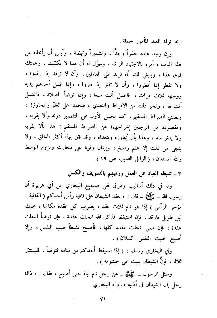 وله في ذلك أساليب وطرق، ففي صحيح البخاري عن أبي هريرة: أن رسول الله صلى الله عليه وسلم قال: (يعقد الشيطان على قافية رأس أحدكم (القافية: مؤخر الرأس) ، إذا هو نام ثلاث عقد، يضرب مكان كل عقدة، عليك ليل طويل فارقد، فإن استيقظ فذكر الله، انحلت عقدة، فإن توضأ، انحلت عقدة، فإن صلى، انحلت عقدة، فأصبح نشيطاً طيب النفس، وإلا أصبح خبيث النفس كسلان) (¬2) .