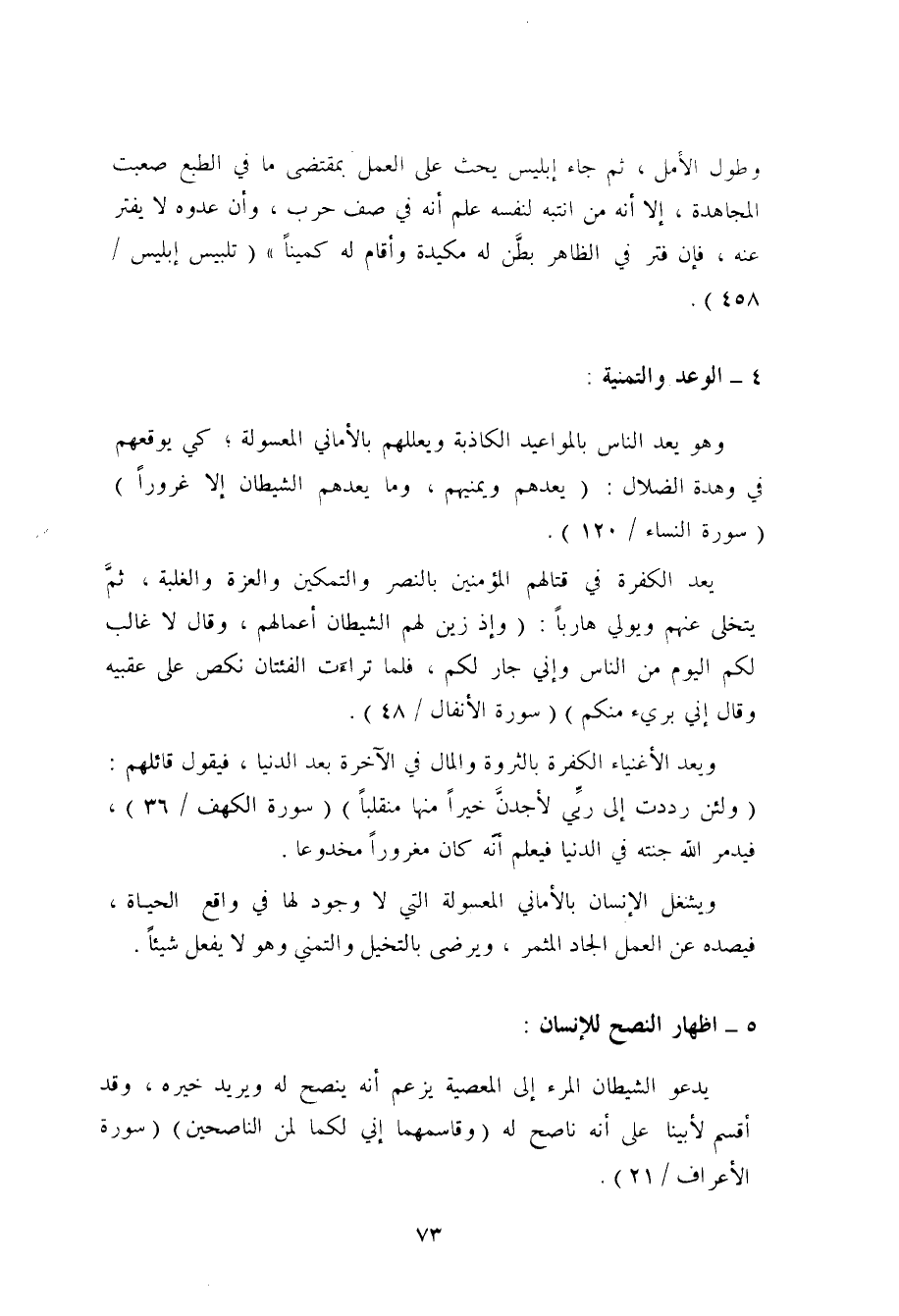 وهو يعد الناس بالمواعيد الكاذبة، ويعللهم بالأماني المعسولة؛ كي يوقعهم في وهدة الضلال: (يعدهم ويمنيهم وما يعدهم الشَّيطان إلاَّ غروراً) [النساء: 120] .