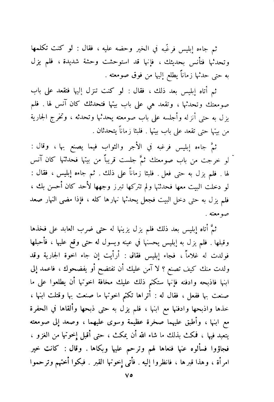 ثم جاءه إبليس، فقال: لو دخلت البيت معها فحدثتها، ولم تتركها تبرز وجهها لأحد كان أحسن بك، فلم يزل به حتى دخل البيت فجعل يحدثها، نهارها كله، فإذا مضى النهار صعد صومعته.