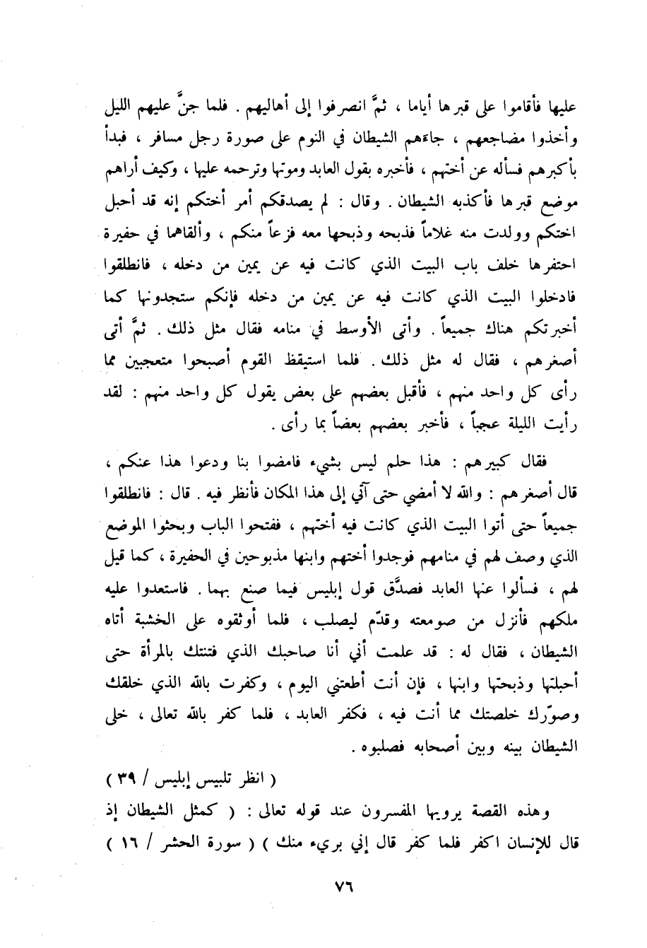 فقال كبيرهم: هذا حلم ليس بشيء، فامضوا بنا ودعوا هذا عنكم، قال أصغرهم: والله لا أمضي حتى آتي هذا المكان، فأنظر فيه. قال: فانطلقوا حتى أتوا البيت الذي كانت فيه أختهم، ففتحوا الباب، وبحثوا الموضع الذي وصف لهم في منامهم، فوجدوا أختهم وابنها مذبوحين في الحفيرة، كما قيل لهم، فسألوا عنها العابد فصدّق قول إبليس فيما صنع بهما، فاستَعْدَوْا عليه ملكهم، فأنزل من صومعته، وقدّم ليصلب.