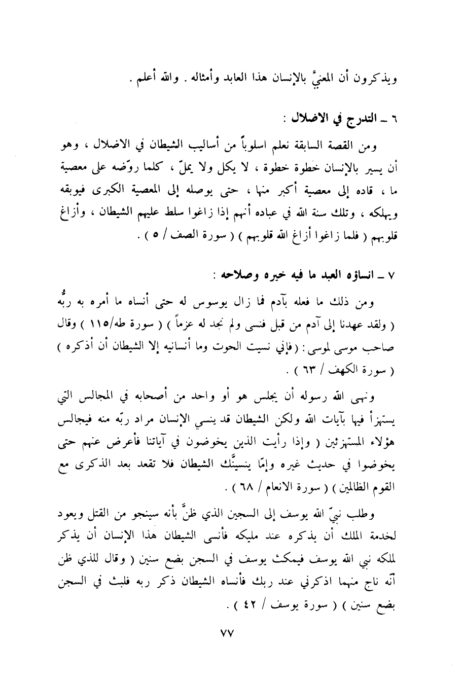 ومن ذلك ما فعله بآدم، فما زال يوسوس له حتى أنساه ما أمره به ربّه: (ولقد عهدنا إلى آدم من قبل فَنَسِيَ ولم نجد له عزماً) [طه: 115] ، وقال صاحب موسى لموسى: (فإني نسيت الحوت وما أَنسَانِيهُ إلاَّ الشَّيطان أن أذكره) [الكهف: 63] .
