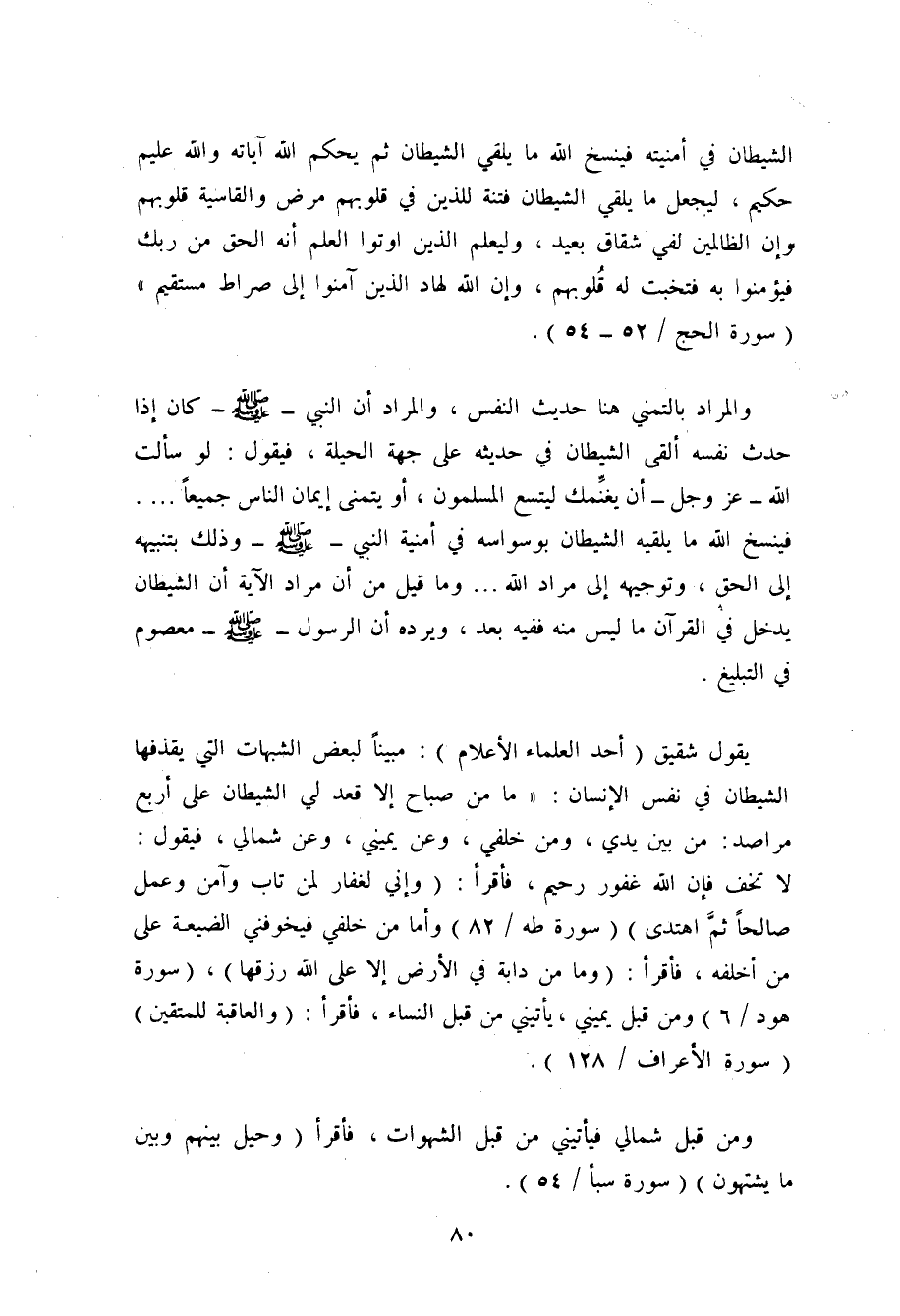 الشَّيطان في أمنيَّته فينسخ الله ما يلقي الشَّيطان ثمَّ يحكم الله آياته والله عليم حكيم - ليجعل ما يلقي الشَّيطان فتنةً للَّذين في قلوبهم مرضٌ والقاسية قلوبهم وإنَّ الظَّالمين لفي شقاق بعيدٍ - وليعلم الَّذين أوتوا العلم أنَّه الحقُّ من ربك فيؤمنوا به فَتُخْبِتَ له قلوبهم وإنَّ الله لهاد الَّذين آمنوا إلى صراطٍ مستقيمٍ) [الحج: 52-54] .