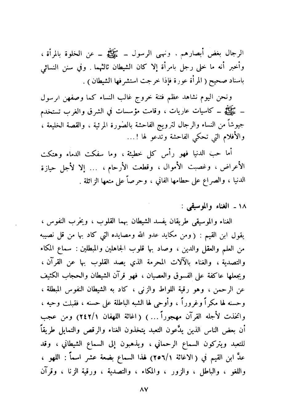 الغناء والموسيقى طريقان يفسد الشيطان بهما القلوب، ويخرب النفوس، يقول ابن القيم: " ومن مكايد عدو الله ومصايده التي كاد بها من قل نصيبه من العلم والعقل والدين، وصاد بها قلوب الجاهلين والمبطلين: سماع المكاء والتصدية، والغناء بالآلات المحرمة، الذي يصد القلوب بها عن القرآن، ويجعلها عاكفة على الفسوق والعصيان، فهو قرآن الشيطان، والحجاب الكثيف عن الرحمن، وهو رقية اللواط والزنى، كاد به الشيطان النفوس المبطلة، وحسنه لها مكراً وغروراً، وأوحى لها الشبه الباطلة على حسنه، فقبلت وحيه، واتخذت لأجله القرآن مهجوراً.... " (¬2) .