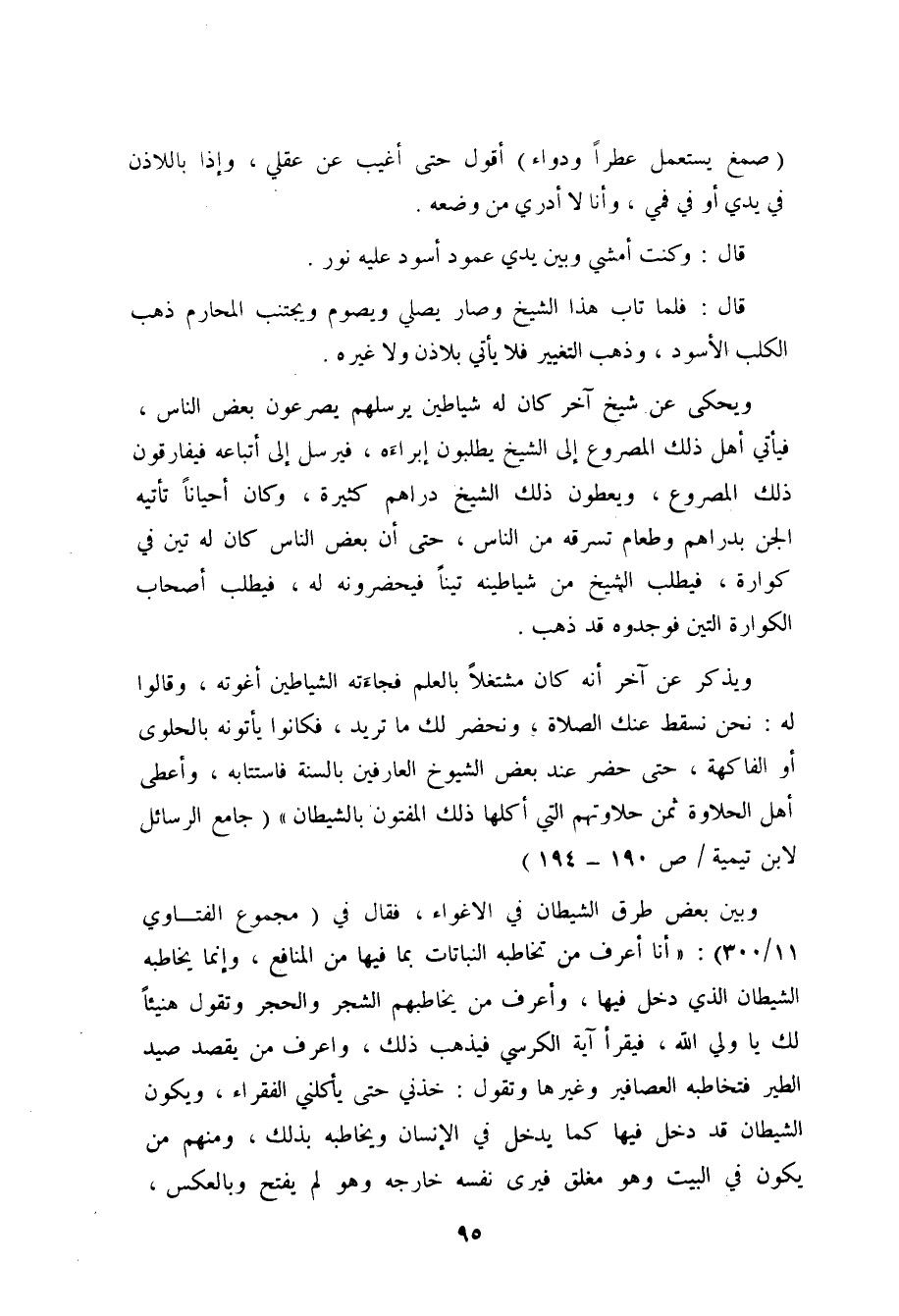 ويذكر عن آخر أنه كان مشتغلاً بالعلم فجاءَته الشياطين وأغوته، وقالوا له: نحن نسقط عنك الصلاة، ونحضر لك ما تريد، فكانوا يأتونه بالحلوى، حتى حضر عند بعض الشيوخ العارفين بالسنة فاستتابه، وأعطى أهل الحلاوة ثمن حلاوتهم التي أكلها ذلك المفتون بالشيطان " (¬1) .