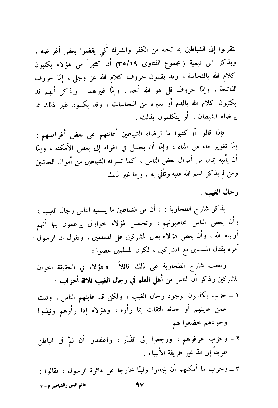 يذكر شارح الطحاوية: " أن من الشياطين ما يسميه الناس رجال الغيب، وأن بعض الناس يخاطبونهم، وتحصل لهؤلاء خوارق يزعمون بها أنهم أولياء الله، وأن بعض هؤلاء يعين المشركين على المسلمين، ويقول: إن الرسول أمره بقتال المسلمين مع المشركين، لكون المسلمين عَصَوْا ".