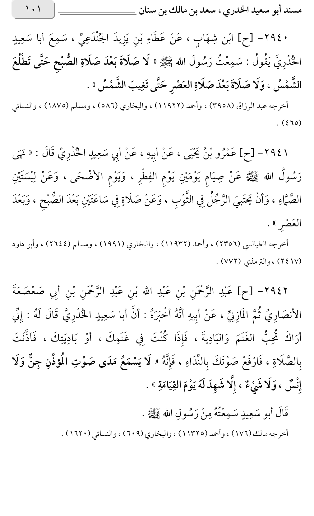 ٢٩٤٠ - [ح] ابْن شِهَابٍ، عَنْ عَطَاءِ بْنِ يَزِيدَ الجُنْدَعِيِّ، سَمِعَ أبا سَعِيدٍ الخُدْرِيَّ يَقُولُ: سَمِعْتُ رَسُولَ الله صلى الله عليه وسلم «لَا صَلَاةَ بَعْدَ صَلَاةِ الصُّبْحِ حَتَّى تَطْلُعَ الشَّمْسُ، وَلَا صَلَاةَ بَعْدَ صَلَاةِ العَصْرِ حَتَّى تَغِيبَ الشَّمْسُ».