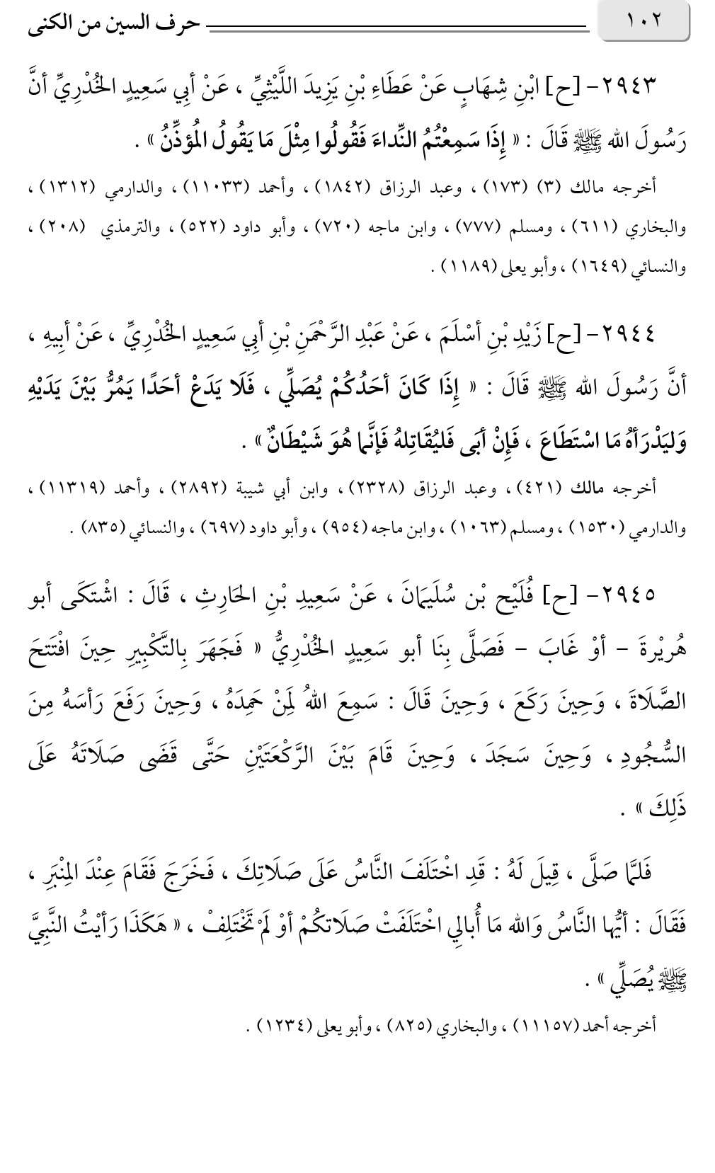 ٢٩٤٤ - [ح] زَيْدِ بْنِ أسْلَمَ، عَنْ عَبْدِ الرَّحْمَنِ بْنِ أبِي سَعِيدٍ الخُدْرِيِّ، عَنْ أبِيهِ، أنَّ رَسُولَ الله صلى الله عليه وسلم قَالَ: «إِذَا كَانَ أحَدُكُمْ يُصَلِّي، فَلَا يَدَعْ أحَدًا يَمُرُّ بَيْنَ يَدَيْهِ وَليَدْرَأهُ مَا اسْتَطَاعَ، فَإِنْ أبَى فَليُقَاتِلهُ فَإنَّما هُوَ شَيْطَانٌ».