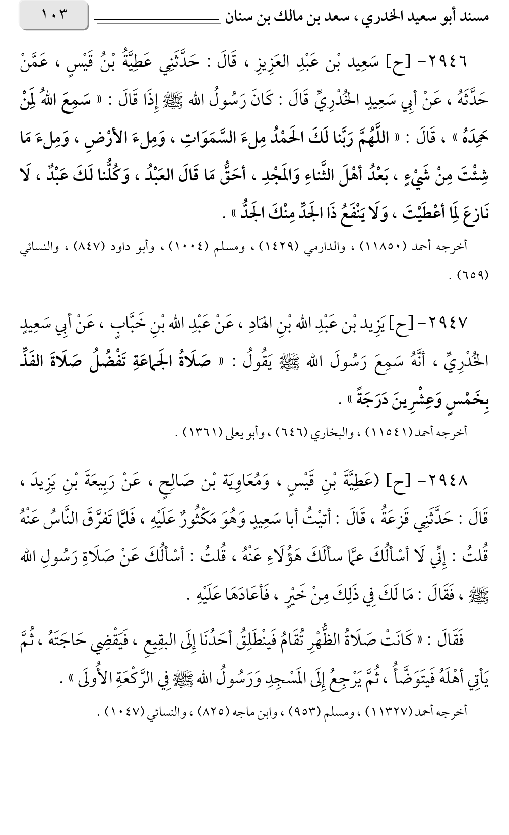 ٢٩٤٦ - [ح] سَعِيد بْن عَبْدِ العَزِيزِ، قَالَ: حَدَّثَنِي عَطِيَّةُ بْنُ قَيْسٍ، عَمَّنْ حَدَّثَهُ، عَنْ أبِي سَعِيدٍ الخُدْرِيِّ قَالَ: كَانَ رَسُولُ الله صلى الله عليه وسلم إِذَا قَالَ: «سَمِعَ اللهُ لمَنْ حَمِدَهُ» قَالَ: «اللَّهُمَّ رَبَّنا لَكَ الحَمْدُ مِلءَ السَّمَوَاتِ، وَمِلءَ الأرْضِ، وَمِلءَ مَا شِئْتَ مِنْ شَيْءٍ، بَعْدُ أهْلَ الثَّناءِ وَالمَجْدِ، أحَقُّ مَا قَالَ العَبْدُ، وَكُلُّنا لَكَ عَبْدٌ، لَا نَازعَ لمَا أعْطَيْتَ، وَلَا يَنْفَعُ ذَا الجَدِّ مِنْكَ الجَدُّ».