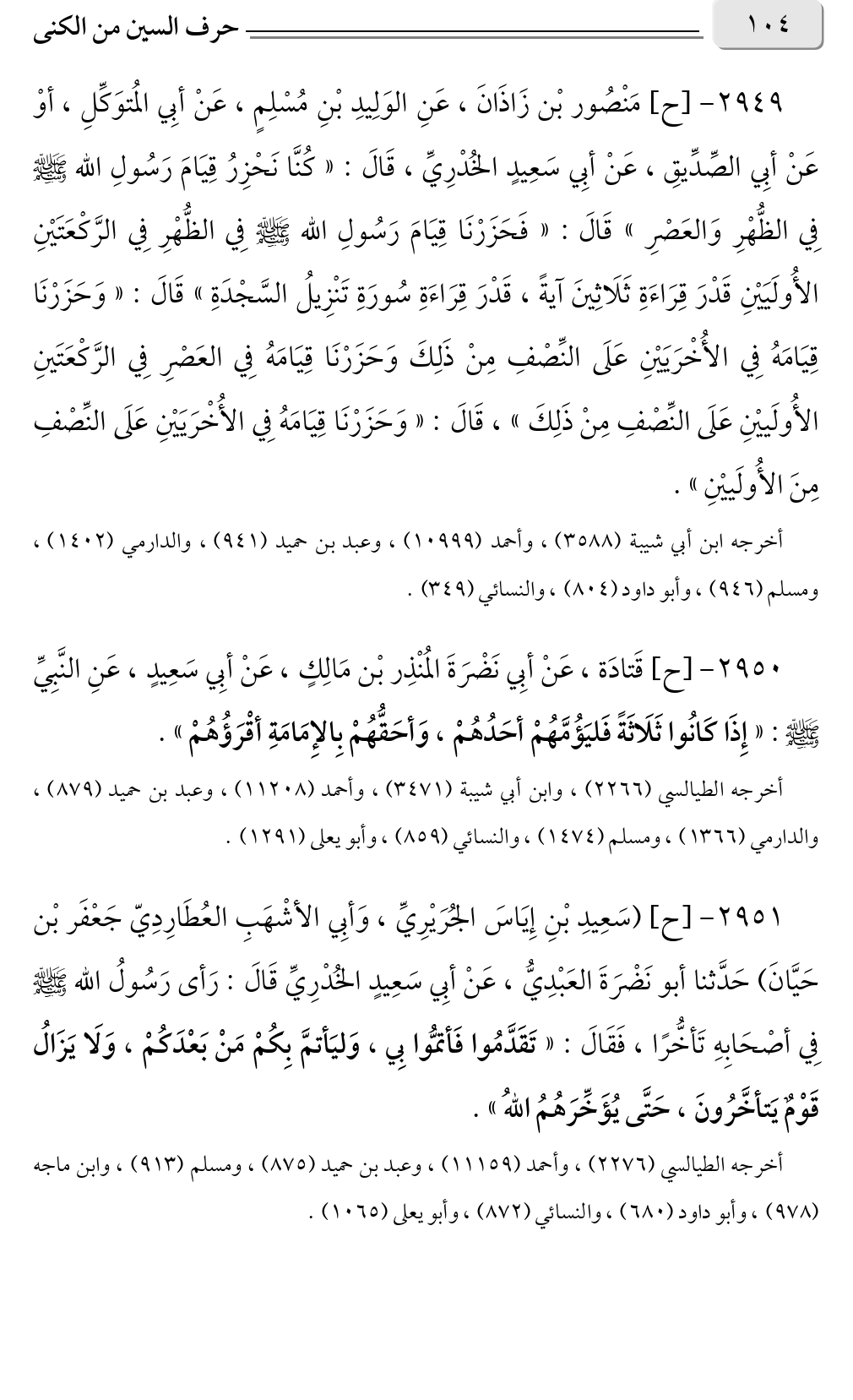 ٢٩٤٩ - [ح] مَنْصُور بْن زَاذَانَ، عَنِ الوَلِيدِ بْنِ مُسْلِمٍ، عَنْ أبِي المُتوَكِّلِ، أوْ عَنْ أبِي الصِّدِّيقِ، عَنْ أبِي سَعِيدٍ الخُدْرِيِّ، قَالَ: «كُنَّا نَحْزِرُ قِيَامَ رَسُولِ الله صلى الله عليه وسلم فِي الظُّهْرِ وَالعَصْرِ» قَالَ: «فَحَزَرْنَا قِيَامَ رَسُولِ الله صلى الله عليه وسلم فِي الظُّهْرِ فِي الرَّكْعَتَيْنِ الأُولَيَيْنِ قَدْرَ قِرَاءَةِ ثَلَاثِينَ آيةً، قَدْرَ قِرَاءَةِ سُورَةِ تَنْزِيلُ السَّجْدَةِ» قَالَ: «وَحَزَرْنَا قِيَامَهُ فِي الأُخْرَيَيْنِ عَلَى النِّصْفِ مِنْ ذَلِكَ وَحَزَرْنَا قِيَامَهُ فِي العَصْرِ فِي الرَّكْعَتَينِ الأُولَييْنِ عَلَى النِّصْفِ مِنْ ذَلِكَ» قَالَ: «وَحَزَرْنَا قِيَامَهُ فِي الأُخْرَيَيْنِ عَلَى النِّصْفِ مِنَ الأُولَييْنِ».