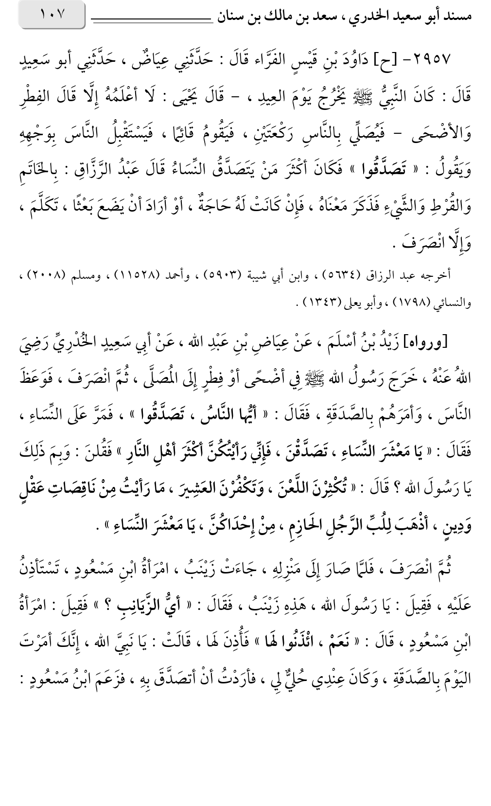 [ورواه] زَيْدُ بْنُ أسْلَمَ، عَنْ عِيَاضِ بْنِ عَبْدِ الله، عَنْ أبِي سَعِيدٍ الخُدْرِيِّ رَضِيَ اللهُ عَنْهُ، خَرَجَ رَسُولُ الله صلى الله عليه وسلم فِي أضْحًى أوْ فِطْرٍ إِلَى المُصَلَّى، ثُمَّ انْصَرَفَ، فَوَعَظَ النَّاسَ، وَأمَرَهُمْ بِالصَّدَقَةِ، فَقَالَ: «أيُّها النَّاسُ، تَصَدَّقُوا» فَمَرَّ عَلَى النِّسَاءِ، فَقَالَ: «يَا مَعْشَرَ النِّسَاءِ، تَصَدَّقْنَ، فَإِنِّي رَأيْتُكُنَّ أكْثَرَ أهْلِ النَّارِ» فَقُلنَ: وَبِمَ ذَلِكَ يَا رَسُولَ الله؟ قَالَ: «تُكْثِرْنَ اللَّعْنَ، وَتَكْفُرْنَ العَشِيرَ، مَا رَأيْتُ مِنْ نَاقِصَاتِ عَقْلٍ وَدِينٍ، أذْهَبَ لِلُبِّ الرَّجُلِ الحَازِمِ، مِنْ إِحْدَاكُنَّ، يَا مَعْشَرَ النِّسَاءِ».