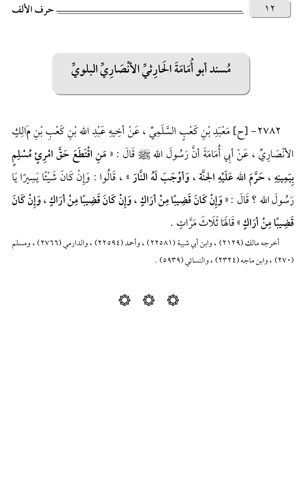 ٢٧٨٢ - [ح] مَعْبَدِ بْنِ كَعْبٍ السَّلَمِيِّ، عَنْ أخِيهِ عَبْدِ الله بْنِ كَعْبِ بْنِ مَالِكٍ الأنْصَارِيِّ، عَنْ أبِي أُمَامَةَ أنَّ رَسُولَ الله صلى الله عليه وسلم قَالَ: «مَنِ اقْتَطَعَ حَقَّ امْرِئٍ مُسْلِمٍ بِيَمِينِهِ، حَرَّمَ الله عَلَيْهِ الجنَّة، وَأوْجَبَ لَهُ النَّارَ» قَالُوا: وَإِنْ كَانَ شَيْئًا يَسِيرًا يَا، رَسُولَ الله؟ قَالَ: «وَإِنْ كَانَ قَضِيبًا مِنْ أرَاكٍ، وَإِنْ كَانَ قَضِيبًا مِنْ أرَاكٍ، وَإِنْ كَانَ قَضِيبًا مِنْ أرَاكٍ» قَالَهَا ثَلَاثَ مَرَّاتٍ.