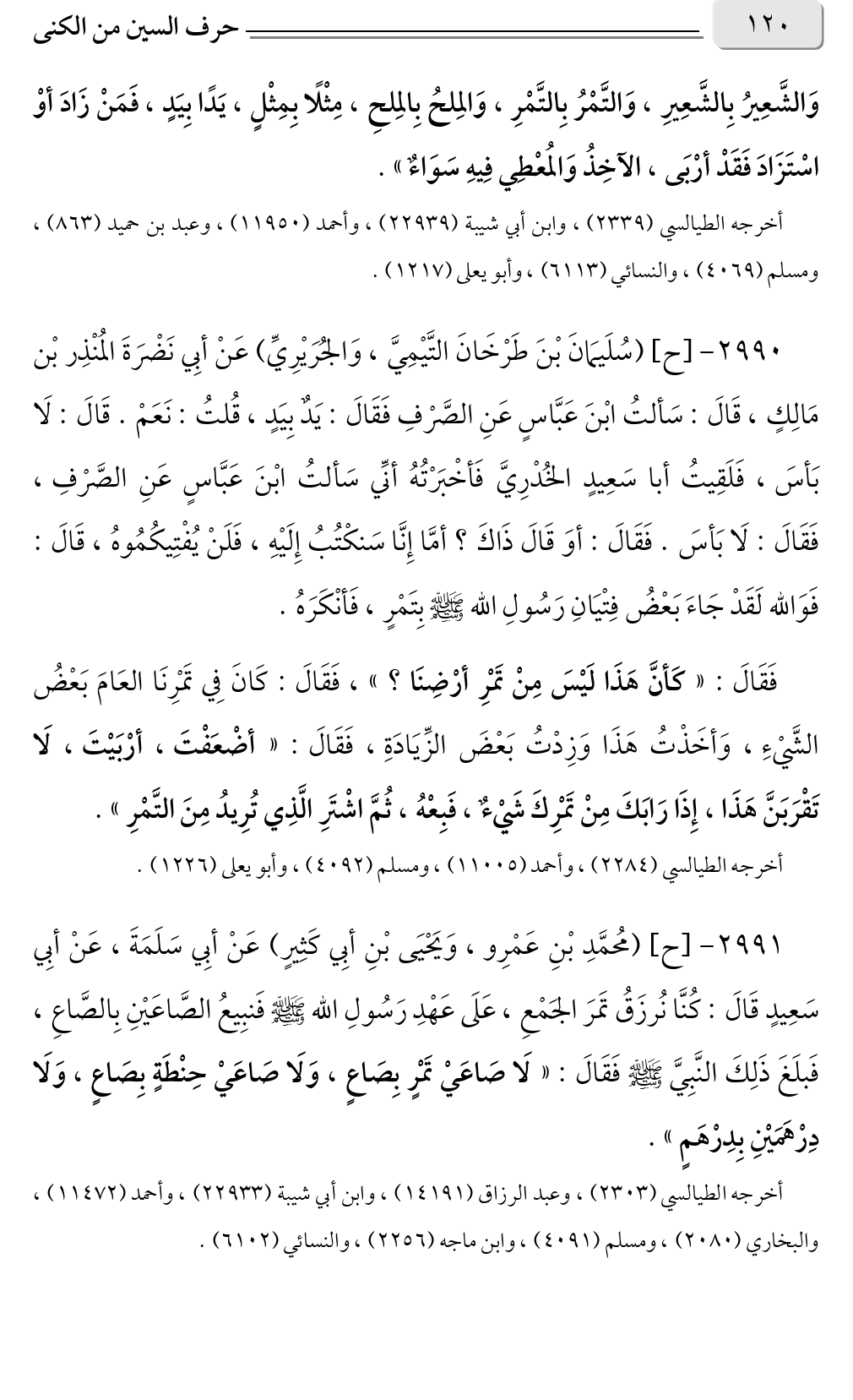 ٢٩٩٠ - [ح] (سُلَيمَانَ بْنَ طَرْخَانَ التَّيْمِيَّ، وَالجُرَيْرِيِّ) عَنْ أبِي نَضْرَةَ المُنْذِر بْن مَالِكٍ، قَالَ: سَألتُ ابْنَ عَبَّاسٍ عَنِ الصَّرْفِ فَقَالَ: يَدٌ بِيَدٍ، قُلتُ: نَعَمْ. قَالَ: لَا بَأسَ، فَلَقِيتُ أبا سَعِيدٍ الخُدْرِيَّ فَأخْبَرْتُهُ أنِّي سَألتُ ابْنَ عَبَّاسٍ عَنِ الصَّرْفِ، فَقَالَ: لَا بَأسَ. فَقَالَ: أوَ قَالَ ذَاكَ؟ أمَّا إِنَّا سَنكْتُبُ إِلَيْهِ، فَلَنْ يُفْتِيكُمُوهُ، قَالَ: فَوَالله لَقَدْ جَاءَ بَعْضُ فِتْيَانِ رَسُولِ الله صلى الله عليه وسلم بِتَمْرٍ، فَأنْكَرَهُ.