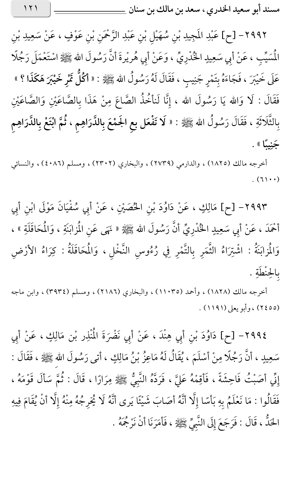 ٢٩٩٣ - [ح] مَالِكٍ، عَنْ دَاوُدَ بْنِ الحُصَيْنِ، عَنْ أبِي سُفْيَانَ مَوْلَى ابْنِ أبِي أحْمَدَ، عَنْ أبِي سَعِيدٍ الخُدْرِيِّ أنَّ رَسُولَ الله صلى الله عليه وسلم «نَهَى عَنِ المُزابَنَةِ، وَالمُحَاقَلَةِ»، وَالمُزابَنَةُ: اشْتِرَاءُ الثَّمَرِ بِالتَّمْرِ فِي رُءُوسِ النَّخْلِ، وَالمُحَاقَلَةُ: كِرَاءُ الأرْضِ بِالحِنْطَةِ.
