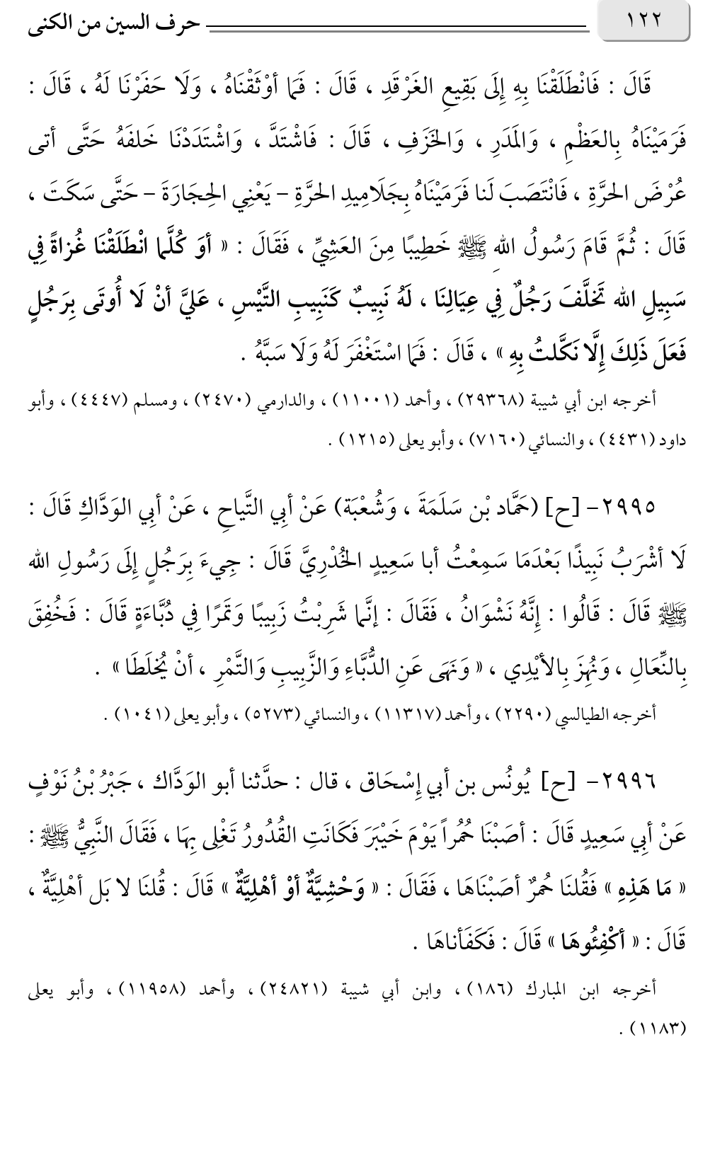٢٩٩٦ - [ح] يُونُس بن أبي إِسْحَاق، قال: حدَّثنا أبو الوَدَّاك، جَبْرُ بْنُ نَوْفٍ عَنْ أبِي سَعِيدٍ قَالَ: أصَبْنَا حُمُرًا يَوْمَ خَيْبَرَ فَكَانَتِ القُدُورُ تَغْلى بِهَا، فَقَالَ النَّبِيُّ صلى الله عليه وسلم: «مَا هَذِهِ» فَقُلنَا حُمرٌ أصَبْنَاهَا، فَقَالَ: «وَحْشِيَّةٌ أوْ أهْلِيَّةٌ» قَالَ: قُلنَا لا بَل أهْلِيَّةٌ، قَالَ: «أكْفِئُوهَا» قَالَ: فَكَفَأناهَا.