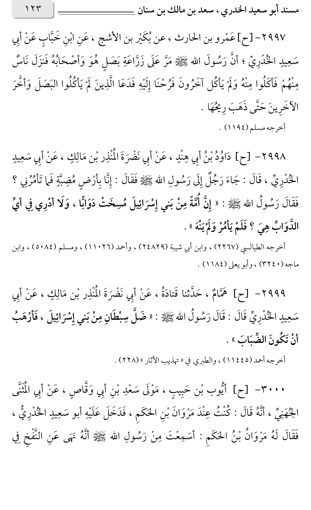 ٢٩٩٨ - [ح] دَاوُدُ بْنُ أبِي هِنْدٍ، عَنْ أبِي نَضْرَةَ المُنْذِر بْن مَالِكٍ، عَنْ أبِي سَعِيدٍ الخُدْرِيِّ، قَالَ: جَاءَ رَجُلٌ إِلَى رَسُولِ الله صلى الله عليه وسلم فَقَالَ: إِنَّا بِأرْضٍ مُضِبَّةٍ فَما تَأمُرُنِي؟ فَقَالَ رَسُولُ الله صلى الله عليه وسلم: «إِنَّ أُمَّةً مِنْ بَني إِسْرَائِيلَ مُسِخَتْ دَوَابًّا، وَلَا أدْرِي فِي أيِّ الدَّوَابِّ هِيَ؟ فَلَمْ يَأمُرْ وَلَمْ يَنْهَ».