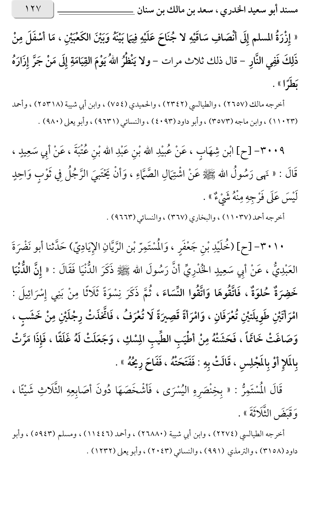 أخرجه مالك (٢٦٥٧)، والطيالسي (٢٣٤٢)، والحميدي (٧٥٤)، وابن أبي شيبة (٢٥٣١٨)، وأحمد (١١٠٢٣)، وابن ماجة (٣٥٧٣)، وأبو داود (٤٠٩٣)، والنسائي (٩٦٣١)، وأبو يعلى (٩٨٠).
