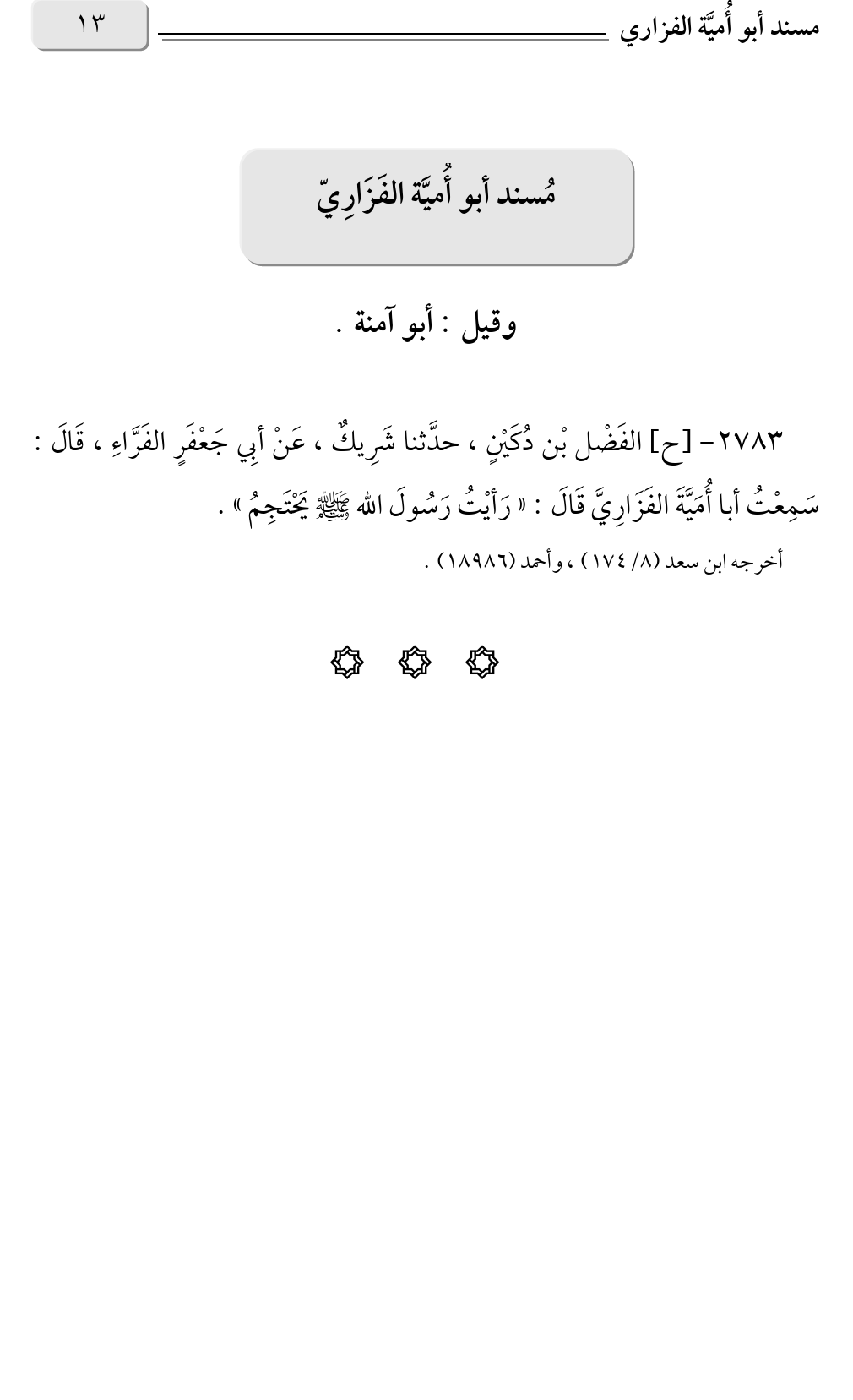٢٧٨٣ - [ح] الفَضْل بْن دُكَيْنٍ، حدَّثنا شَرِيكٌ، عَنْ أبِي جَعْفَرٍ الفَرَّاءِ، قَالَ: سَمِعْتُ أبا أُمَيَّةَ الفَزَارِيَّ قَالَ: «رَأيْتُ رَسُولَ الله صلى الله عليه وسلم يَحْتَجِمُ».