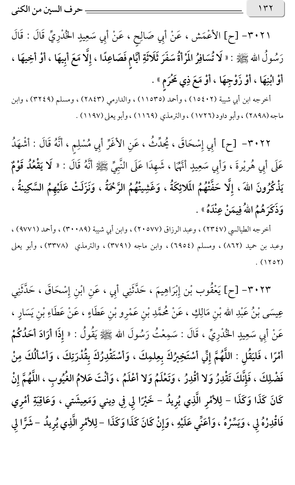 ٣٠٢١ - [ح] الأعْمَش، عَنْ أبِي صَالِحٍ، عَنْ أبِي سَعِيدٍ الخُدْرِيِّ قَالَ: قَالَ رَسُولُ الله صلى الله عليه وسلم: «لَا تُسَافِرُ المَرْأةُ سَفَرَ ثَلَاثَةِ أيَّامٍ فَصَاعِدًا، إِلَّا مَعَ أبِيهَا، أوْ أخِيهَا، أوْ ابْنِهَا، أوْ زَوْجِهَا، أوْ مَعَ ذِي مَحْرَمٍ».