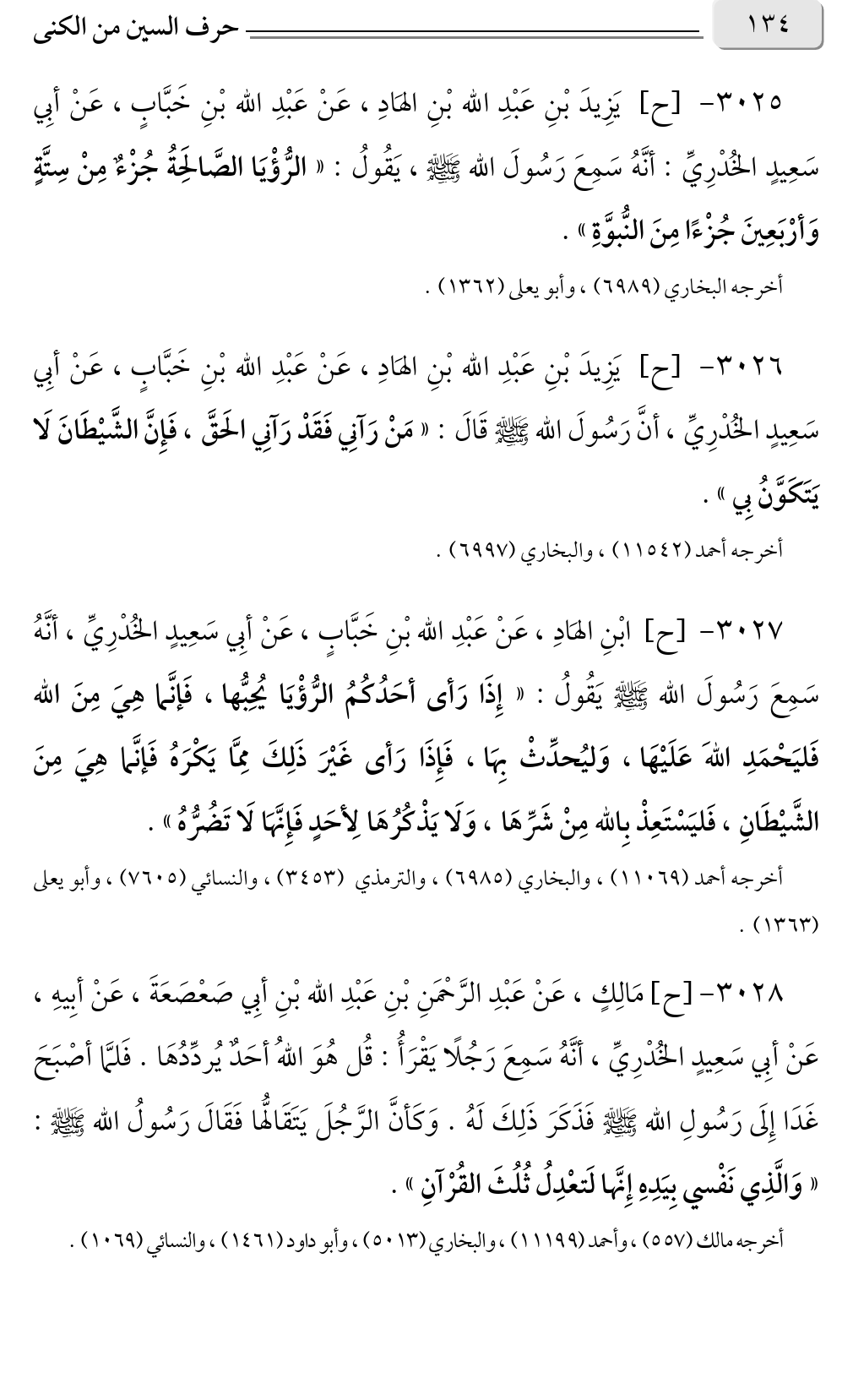 ٣٠٢٥ - [ح] يَزِيدَ بْنِ عَبْدِ الله بْنِ الهَادِ، عَنْ عَبْدِ الله بْنِ خَبَّابٍ، عَنْ أبِي سَعِيدٍ الخُدْرِيِّ: أنَّهُ سَمِعَ رَسُولَ الله صلى الله عليه وسلم، يَقُولُ: «الرُّؤْيَا الصَّالحَةُ جُزْءٌ مِنْ سِتَّةٍ وَأرْبَعِينَ جُزْءًا مِنَ النُّبوَّةِ».