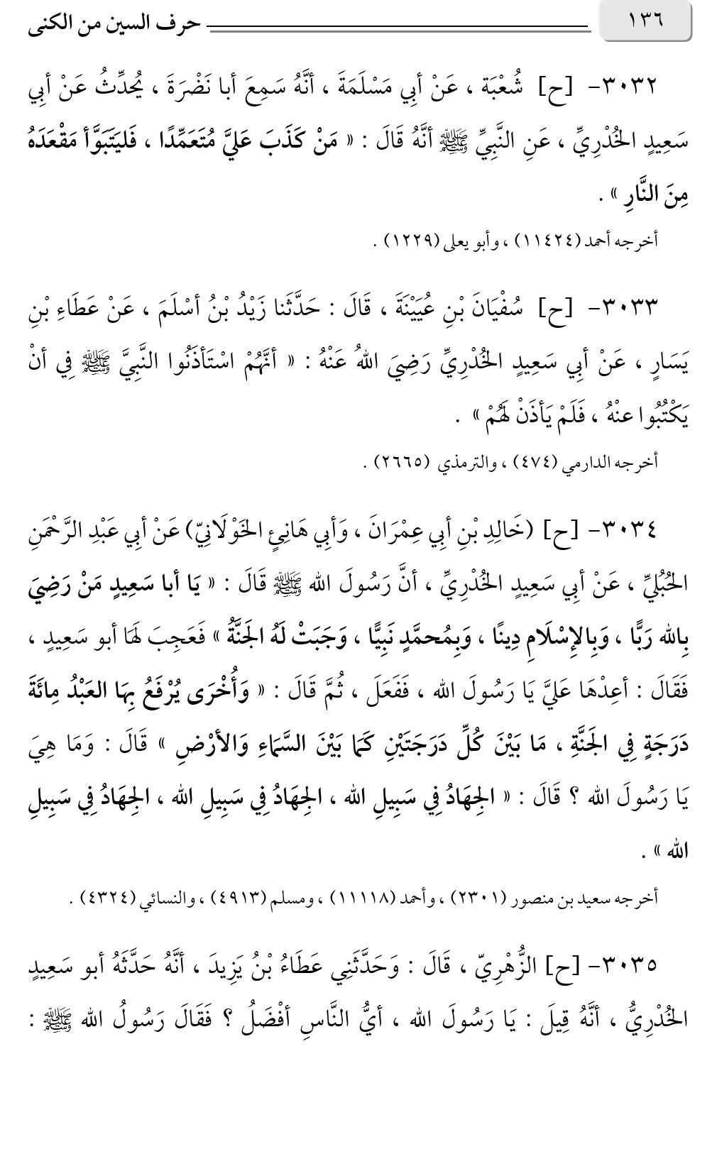 الحُبُليِّ، عَنْ أبِي سَعِيدٍ الخُدْرِيِّ، أنَّ رَسُولَ الله صلى الله عليه وسلم قَالَ: «يَا أبا سَعِيدٍ مَنْ رَضِيَ بِالله رَبًّا وَبِالإِسْلَامِ دِينًا، وَبِمُحمَّدٍ نَبِيًّا، وَجَبَتْ لَهُ الجَنَّةُ» فَعَجِبَ لَهَا أبو سَعِيدٍ، فَقَالَ: أعِدْهَا عَليَّ يَا رَسُولَ الله، فَفَعَلَ، ثُمَّ قَالَ: «وَأُخْرَى يُرْفَعُ بِهَا العَبْدُ مِائَةَ دَرَجَةٍ فِي الجَنَّةِ، مَا بَيْنَ كُلِّ دَرَجَتَيْنِ كَمَا بَيْنَ السَّمَاءِ وَالأرْضِ» قَالَ: وَمَا هِيَ يَا رَسُولَ الله؟ قَالَ: «الجِهَادُ فِي سَبِيلِ الله، الجِهَادُ فِي سَبِيلِ الله، الجِهَادُ فِي سَبِيلِ الله».