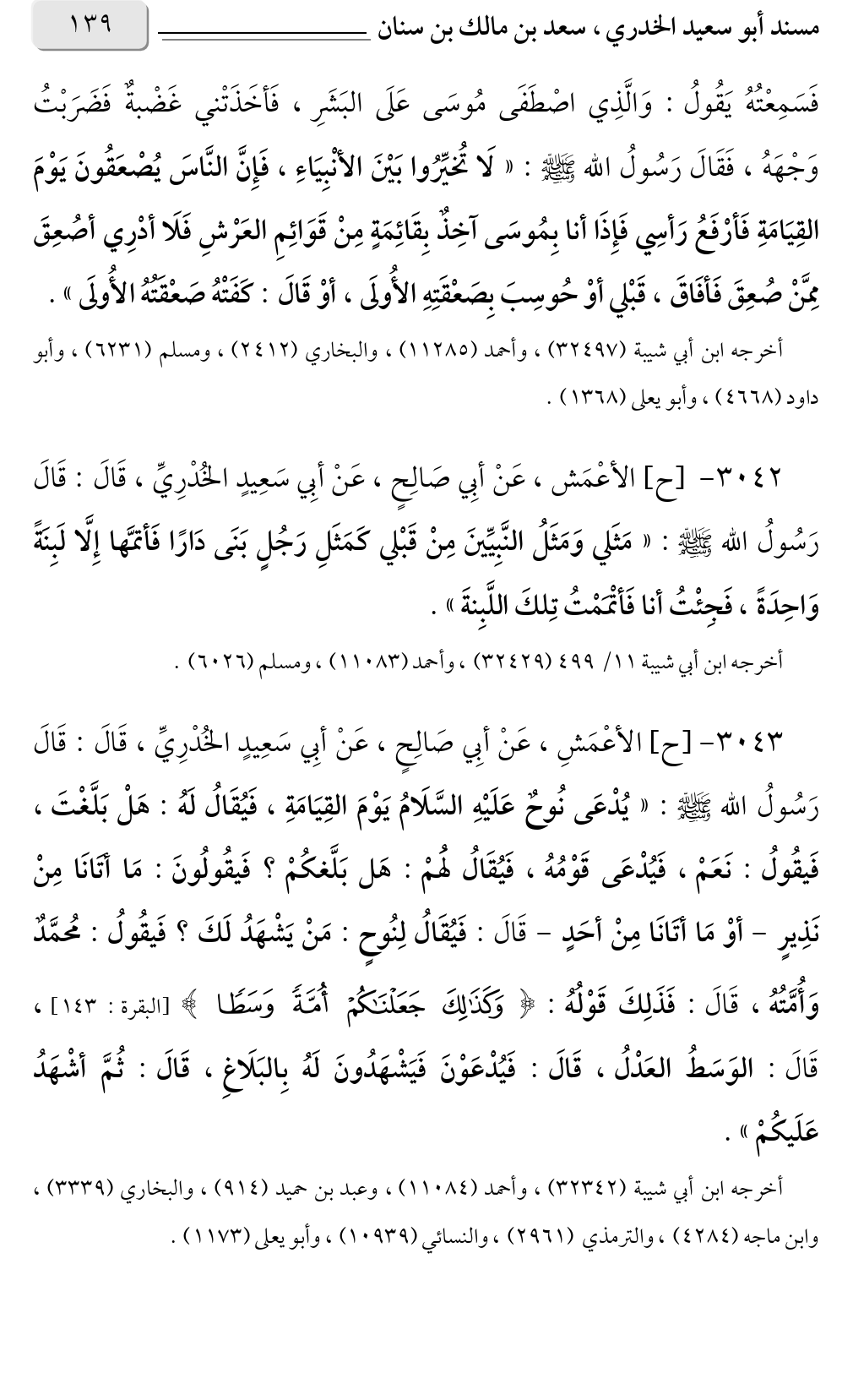 ٣٠٤٣ - [ح] الأعْمَشِ، عَنْ أبِي صَالِحٍ، عَنْ أبِي سَعِيدٍ الخُدْرِيِّ، قَالَ: قَالَ رَسُولُ الله صلى الله عليه وسلم: «يُدْعَى نُوحٌ عَلَيْهِ السَّلَامُ يَوْمَ القِيَامَةِ، فَيُقَالُ لَهُ: هَلْ بَلَّغْتَ، فَيقُولُ: نَعَمْ، فَيُدْعَى قَوْمُهُ، فَيُقَالُ لهُمْ: هَل بَلَّغكُمْ؟ فَيقُولُونَ: مَا أتَانَا مِنْ نَذِيرٍ - أوْ مَا أتَانَا مِنْ أحَدٍ - قَالَ: فَيُقَالُ لِنُوحٍ: مَنْ يَشْهَدُ لَكَ؟ فَيقُولُ: مُحمَّدٌ وَأُمَّتُهُ، قَالَ: فَذَلِكَ قَوْلُهُ: {وَكَذَلِكَ جَعَلْنَاكُمْ أُمَّةً وَسَطًا} [البقرة: ١٤٣]، قَالَ: الوَسَطُ العَدْلُ، قَالَ: فَيُدْعَوْنَ فَيَشْهَدُونَ لَهُ بِالبَلَاغِ، قَالَ: ثُمَّ أشْهَدُ عَلَيكُمْ».