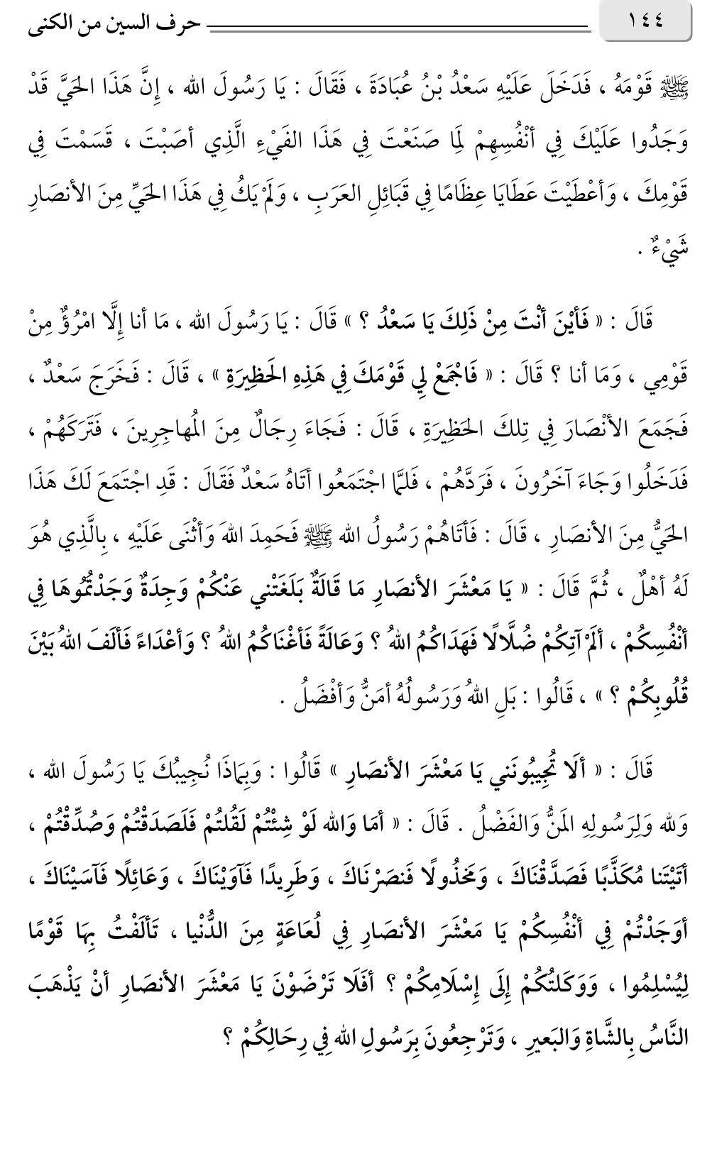 قَالَ: «ألَا تُجِيبُونَني يَا مَعْشَرَ الأنصَارِ» قَالُوا: وَبِمَاذَا نُجِيبُكَ يَا رَسُولَ الله، وَلله وَلِرَسُولِهِ المَنُّ وَالفَضْلُ. قَالَ: «أمَا وَالله لَوْ شِئْتُمْ لَقُلتُمْ فَلَصَدَقْتُمْ وَصُدِّقْتُمْ، أتَيْتَنا مُكَذَّبًا فَصَدَّقْنَاكَ، وَمَخذُولًا فَنصَرْنَاكَ، وَطَرِيدًا فَآوَيْنَاكَ، وَعَائِلًا فَآسَيْنَاكَ، أوَجَدْتُمْ فِي أنْفُسِكُمْ يَا مَعْشَرَ الأنصَارِ فِي لُعَاعَةٍ مِنَ الدُّنْيا، تَألَفْتُ بِهَا قَوْمًا لِيُسْلِمُوا، وَوَكَلتُكُمْ إِلَى إِسْلَامِكُمْ؟ أفَلَا تَرْضَوْنَ يَا مَعْشَرَ الأنصَارِ أنْ يَذْهَبَ النَّاسُ بِالشَّاةِ وَالبَعيرِ، وَتَرْجِعُونَ بِرَسُولِ الله فِي رِحَالِكُمْ؟