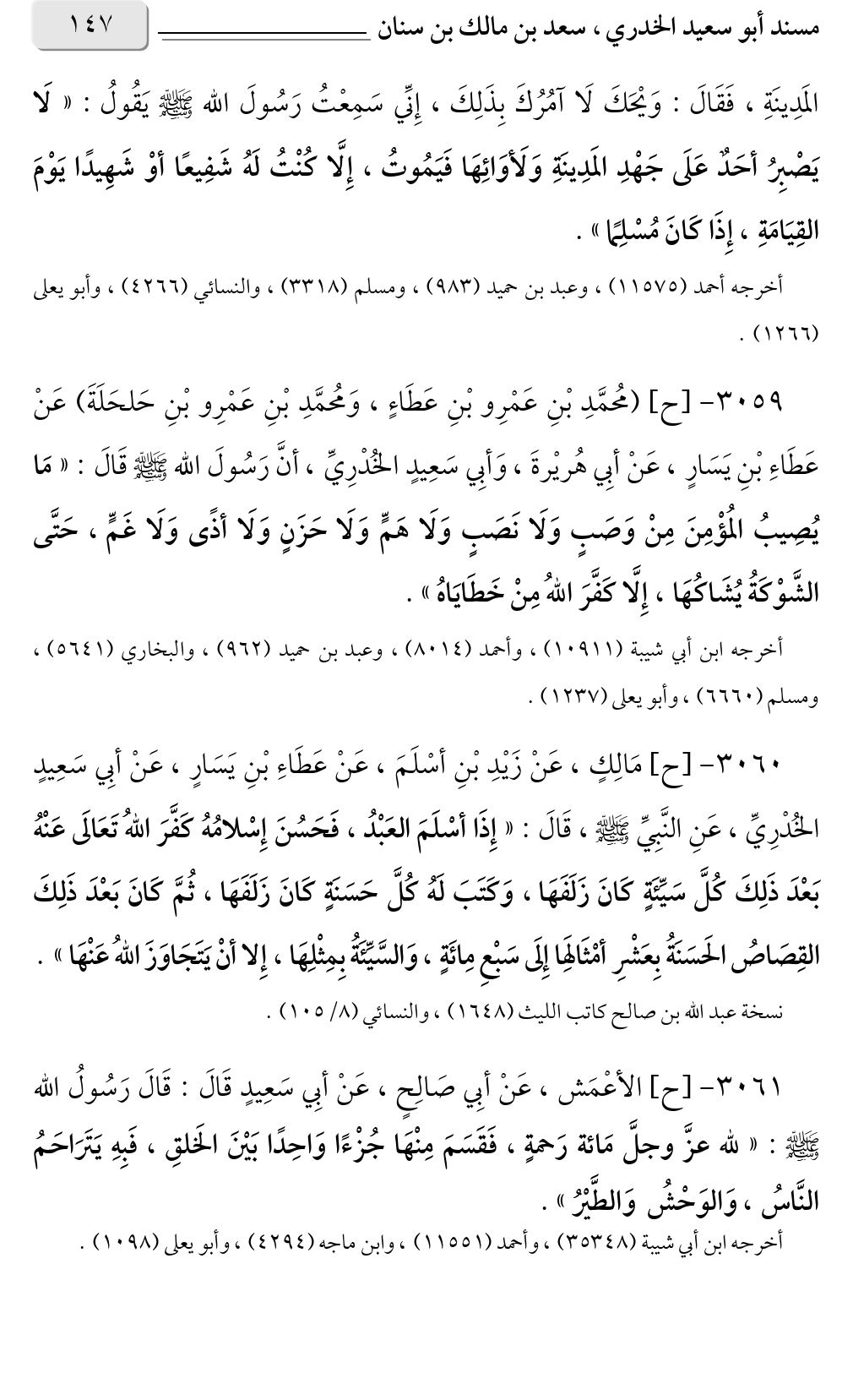 ٣٠٦١ - [ح] الأعْمَش، عَنْ أبِي صَالِحٍ، عَنْ أبِي سَعِيدٍ قَالَ: قَالَ رَسُولُ الله صلى الله عليه وسلم: «لله عزَّ وجلَّ مَائة رَحمةٍ، فَقَسَمَ مِنْهَا جُزْءًا وَاحِدًا بَيْنَ الخَلقِ، فَبِهِ يَتَرَاحَمُ النَّاسُ، وَالوَحْشُ وَالطَّيْرُ».