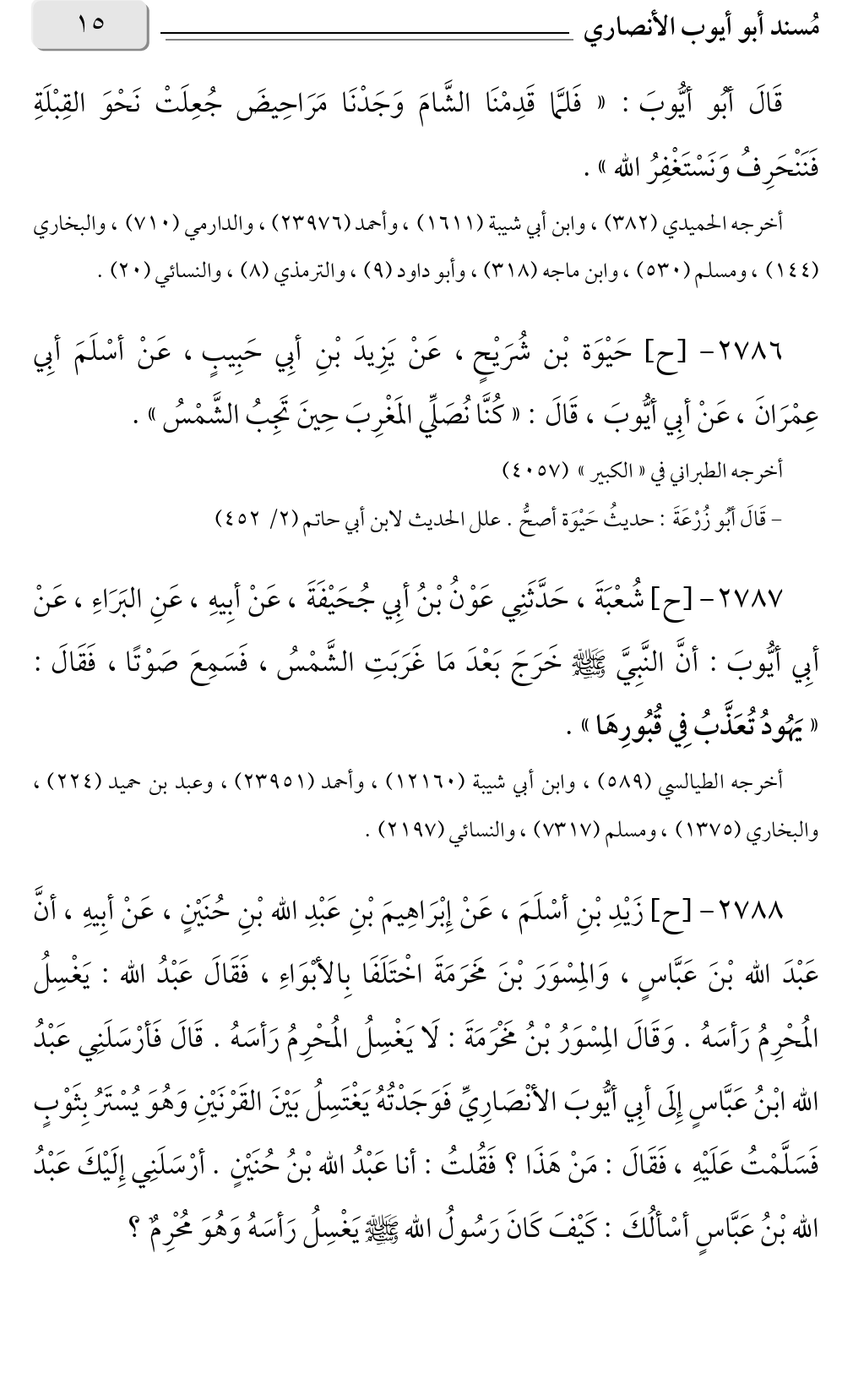 ٢٧٨٦ - [ح] حَيْوَة بْن شُرَيْحٍ، عَنْ يَزِيدَ بْنِ أبِي حَبِيبٍ، عَنْ أسْلَمَ أبِي عِمْرَانَ، عَنْ أبِي أيُّوبَ، قَالَ: «كُنَّا نُصَلِّي المَغْرِبَ حِينَ تَجِبُ الشَّمْسُ».