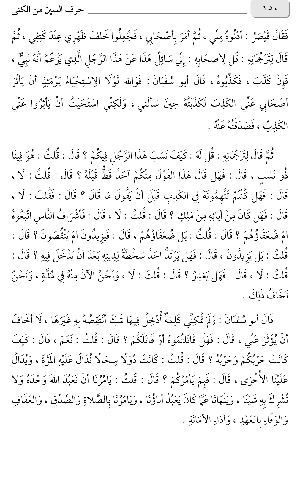 ثُمَّ قَالَ لِتَرْجُمَانِهِ: قُل لَهُ: كَيْفَ نَسَبُ هَذَا الرَّجُلِ فِيكُمْ؟ قَالَ: قُلتُ: هُوَ فِينَا ذُو نَسَبٍ، قَالَ: فَهَل قَالَ هَذَا القَوْلَ مِنْكُمْ أحَدٌ قَطُّ قَبْلَهُ؟ قَالَ: قُلتُ: لَا، قَالَ: فَهَل كُنْتُمْ تَتَّهِمُونَهُ فِي الكَذِبِ قَبْلَ أنْ يَقُولَ مَا قَالَ؟ قَالَ: فَقُلتُ: لَا، قَالَ: فَهَل كَانَ مِنْ أبائِهِ مِنْ مَلِكٍ؟ قَالَ: قُلتُ: لَا، قَالَ: فَأشْرَافُ النَّاسِ اتَّبَعُوهُ أمْ ضُعَفَاؤُهُمْ؟ قَالَ: قُلتُ: بَل ضُعَفَاؤُهُمْ، قَالَ: فَيزِيدُونَ أمْ يَنْقُصُونَ؟ قَالَ: قُلتُ: بَل يَزِيدُونَ، قَالَ: فَهَل يَرْتَدُّ أحَدٌ سَخْطَةً لِدِينِهِ بَعْدَ أنْ يَدْخُلَ فِيهِ؟ قَالَ: قُلتُ: لَا، قَالَ: فَهَل يَغْدِرُ؟ قَالَ: قُلتُ: لَا، وَنَحْنُ الآنَ مِنْهُ فِي مُدَّةٍ، وَنَحْنُ نَخَافُ ذَلِكَ.