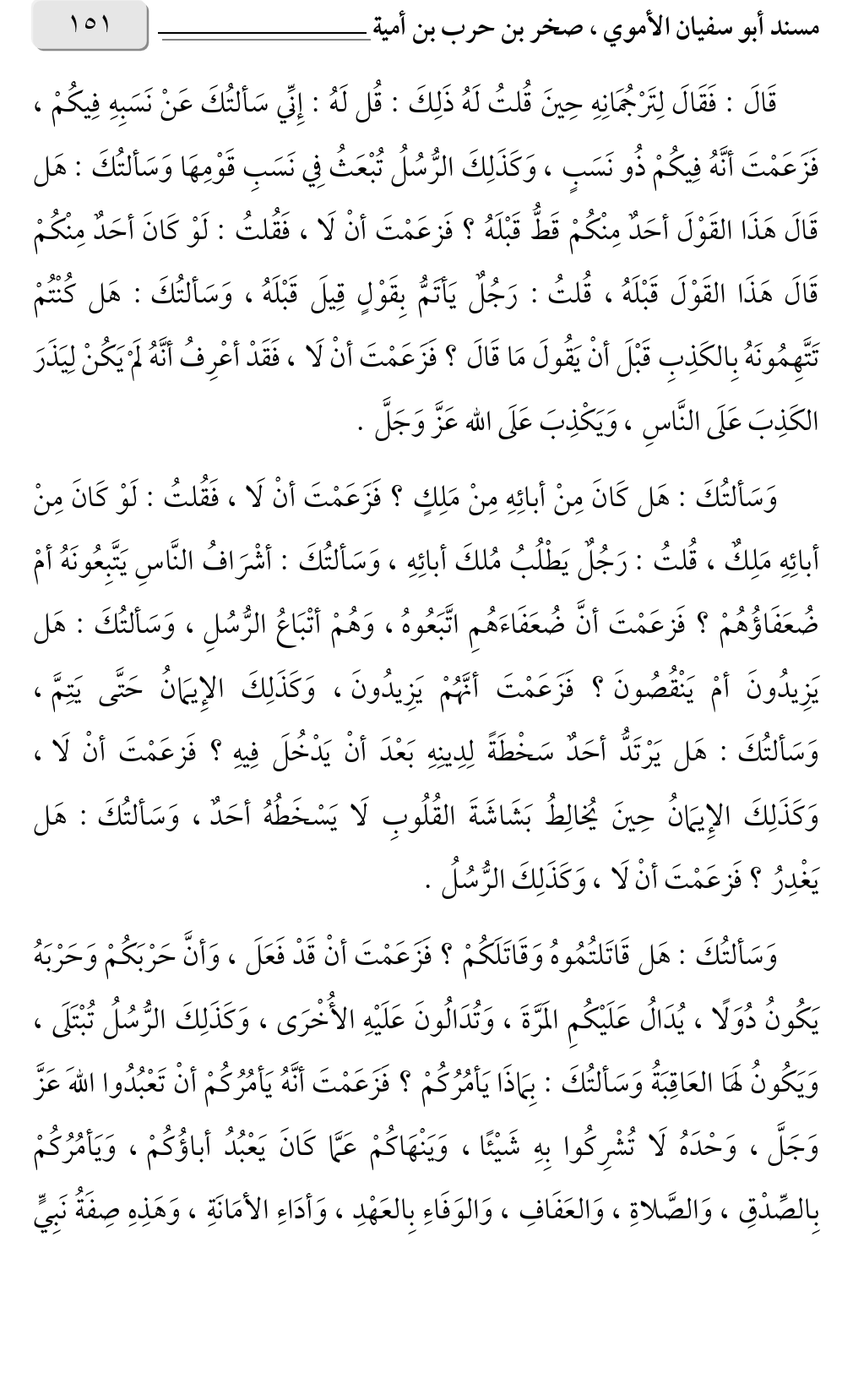 وَسَألتُكَ: هَل كَانَ مِنْ أبائِهِ مِنْ مَلِكٍ؟ فَزَعَمْتَ أنْ لَا، فَقُلتُ: لَوْ كَانَ مِنْ أبائِهِ مَلِكٌ، قُلتُ: رَجُلٌ يَطْلُبُ مُلكَ أبائِهِ، وَسَألتُكَ: أشْرَافُ النَّاسِ يَتَّبِعُونَهُ أمْ ضُعَفَاؤُهُمْ؟ فَزعَمْتَ أنَّ ضُعَفَاءَهُمِ اتَّبَعُوهُ، وَهُمْ أتْبَاعُ الرُّسُلِ، وَسَألتُكَ: هَل يَزِيدُونَ أمْ يَنْقُصُونَ؟ فَزَعَمْتَ أنَّهُمْ يَزِيدُونَ، وَكَذَلِكَ الإِيمَانُ حَتَّى يَتِمَّ، وَسَألتُكَ: هَل يَرْتَدُّ أحَدٌ سَخْطَةً لِدِينِهِ بَعْدَ أنْ يَدْخُلَ فِيهِ؟ فَزعَمْتَ أنْ لَا، وَكَذَلِكَ الإِيمَانُ حِينَ يُخالِطُ بَشَاشَةَ القُلُوبِ لَا يَسْخَطُهُ أحَدٌ، وَسَألتُكَ: هَل يَغْدِرُ؟ فَزعَمْتَ أنْ لَا، وَكَذَلِكَ الرُّسُلُ.