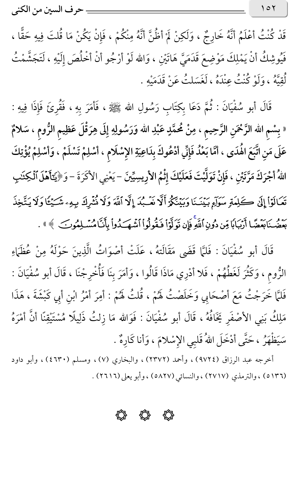 قَدْ كُنْتُ أعْلَمُ أنَّهُ خَارِجٌ، وَلَكِنْ لَمْ أظُنَّ أنَّهُ مِنْكُمْ، فَإِنْ يَكُنْ مَا قُلتَ فِيهِ حَقًّا، فَيُوشِكُ أنْ يَمْلِكَ مَوْضِعَ قَدَمَيَّ هَاتَيْنِ، وَالله لَوْ أرْجُو أنْ أخْلُصَ إِلَيْهِ، لَتَجَشَّمْتُ لُقِيَّهُ، وَلَوْ كُنْتُ عِنْدَهُ، لَغَسَلتُ عَنْ قَدَمَيْهِ. قَالَ أبو سُفْيَانَ: ثُمَّ دَعَا بِكِتَابِ رَسُولِ الله صلى الله عليه وسلم، فَأمَرَ بِهِ، فَقُرِئَ فَإِذَا فِيهِ: «بِسْمِ الله الرَّحْمَنِ الرَّحِيمِ، مِنْ مُحمَّدٍ عَبْدِ الله وَرَسُولِهِ إِلَى هِرَقْلَ عَظِيمِ الرُّومِ، سَلامٌ عَلَى مَنِ اتَّبَعَ الُهدَى، أمَّا بَعْدُ فَإِنِّي أدْعُوكَ بِدَاعِيَةِ الإِسْلَامِ، أسْلِمْ تَسْلَمْ، وَأسْلِمْ يُؤْتِكَ اللهُ أجْرَكَ مَرَّتَيْنِ، فَإِنْ تَوَلَّيْتَ فَعَلَيْكَ إِثْمُ الأرِيسِيِّينَ - يَعْنِي الأكَرَةَ - {قُلْ يَاأَهْلَ الْكِتَابِ تَعَالَوْا إِلَى كَلِمَةٍ سَوَاءٍ بَيْنَنَا وَبَيْنَكُمْ أَلَّا نَعْبُدَ إِلَّا اللَّهَ وَلَا نُشْرِكَ بِهِ شَيْئًا وَلَا يَتَّخِذَ بَعْضُنَا بَعْضًا أَرْبَابًا مِنْ دُونِ اللَّهِ فَإِنْ تَوَلَّوْا فَقُولُوا اشْهَدُوا بِأَنَّا مُسْلِمُونَ}».